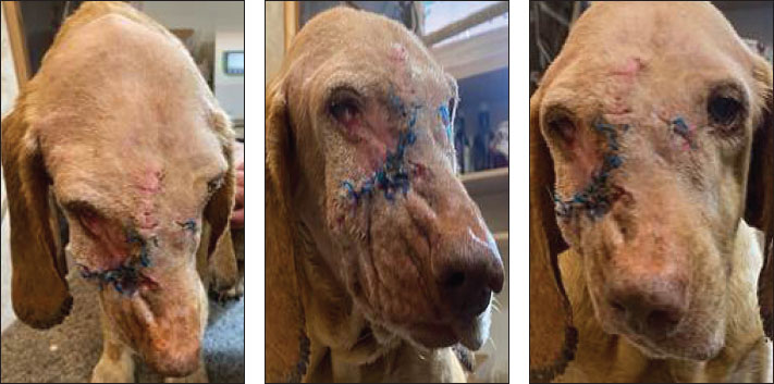 Fig. 4. Gross images after the surgical procedure showing good healing and at least tissue damage. Widespread antibiotics (Cefazolin 20 mg.kg-1 q24 hours) and analgesics (Tramadol 2 mg.kg-1) were administered to prevent infection and control pain management. Sections of the mass reveal a well-circumscribed region composed of sheets of round to polygonal histiocytic cells. The cells exhibit moderate amounts of pale eosinophilic cytoplasm and centrally to eccentrically located round to oval nuclei with finely stippled chromatin and indistinct nucleoli. A mild to moderate infiltrate of small lymphocytes is often observed at the periphery of the lesion (Fig. 5).