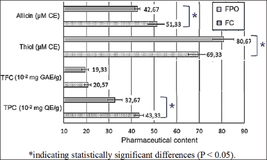 Fig. 2. Allicin, thiol, TFC, and TFC of FPO, and FC. Note: CE, chive extract; GAE, gallic acid equivalents; QE, quercetin equivalent. *Statistically significant differences (P < 0.05). Bioactive compound content and antibacterial activity of fermented onionsThe phenolic and flavonoid contents of the extracts from FPO and FC are shown in Figure 2. As shown in Figure 2, allicin and TPC are key components significantly affecting the antibacterial and antioxidant activities of onion and chive extracts. FC extract contained significantly higher levels of allicin (51.33 μM) and TPC (0.43 mg gallic acid equivalents/g) compared with FPO extract (42.67 μM allicin and 0.32 mg GAE/g) (p < 0.05). Furthermore, FC extract had a significantly higher thiol content (80.67 μM) than FPO extract (69.33 μM) (p < 0.05). The results are presented in Figure 3. Both extracts exhibited inhibitory effects against the tested pathogens (inhibition zone diameter, D > 10 mm), suggesting their potential as natural antibacterial agents in poultry production. However, FC exhibited superior efficacy compared to FPO against most bacterial strains. This was evidenced by the significantly larger (p = 0.036) inhibition zones produced by FC (12.5–17.6 mm) compared with FPO (10.1–16.8 mm) for most strains. Both FPO and FC showed good inhibitory activity against E. coli, with significantly (p < 0.05) larger inhibition zones (15.8–17.6 mm) than those observed for Salmonella spp. (10.1–15.4 mm). For Salmonella spp., the antibacterial activity varied significantly between strains and between the two fermented onion extracts. FC exhibited significantly stronger inhibition (14.1 mm; p = 0.008) than FPO (10.1 mm) against S. gallinarum RKS5078 and S. pullorum NCTC10705. MICs and MBCs of FPO and FC extractsTable 5 presents the MIC and MBC values of the fermented onion and chive extracts against pathogenic microorganisms. The concentrations of the extracts ranged from 0.98 to 250 mg/ml FC extract exhibited stronger antibacterial activity against most of the tested strains, as evidenced by its lower MIC and MBC values compared to FPO extract. Notably, FC had a significantly lower MIC (0.98–1.95 mg/ml vs. 1.95–62.5 mg/ml) against both E. coli strains and S. pullorum, highlighting its potent inhibitory effect against these bacteria. DiscussionThe findings of antibiotic resistance from pathogenic bacterial strains illustrated that Salmonella and E. coli are resistant to multi-antibiotics. These findings align with a recent study in Greece, which reported high resistance rates among E. coli isolates from broiler farms to streptomycin (70.8%), nalidixic acid (73.6%), and sulfamethoxazole (81.1%) (Xexaki et al., 2023). In contrast, the Salmonella isolates in our study exhibited varied resistance patterns. Salmonella strain S21, in particular, exhibited resistance to multiple drug classes, reflecting the global trend toward MDR in Salmonella, as highlighted by Alenazy (2022). A study in Vietnam reported an antibiotic resistance rate of up to 37.89% among Salmonella spp. isolated from chicken meat, with some strains resistant to as many as 11 different antibiotics (Yen et al., 2019). The relatively high rate of antimicrobial resistance in E. coli and Salmonella is likely due to the under-controlled use of various categories of antibiotics in poultry production, including those used for treatment, prevention, and growth promotion. The lack of legal restrictions on the use of antibiotics further exacerbates this issue.