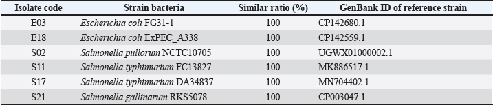 For herbal extract susceptibility testing, wells with diameters of 6 mm were created into MH agar plates inoculated with the bacterial cultures. Each extract (50 μl) was transferred into a well and incubated at 37°C within 24 hours. Measuring inhibition zones was conducted and compared with established standards for antibiotic and herbal extract sensitivity (Kumar et al., 2024). Experimented antibiotics included amoxicillin (30 μg), cefotaxime (15 μg), doxycycline (30 μg), amikacin (10 μg), ciprofloxacin (30 μg), ceftriaxone (10 μg), ofloxacin (10 μg), nitrofurantoin (15 μg), and spiramycin (30 μg) (CLSI, 2024). Minimum inhibitory concentration (MIC) and minimum bactericidal concentration (MBC) valuesThe broth microdilution method was used to determine the MIC and MBC of onion and chive extracts. Each extract at an initial concentration of 500 mg/ml was serially two-fold diluted to achieve a concentration range of 250–0.988 mg/ml. Nine sterile test tubes were used for each extract. One tube served as a negative control (extract only), and another tube containing tetracycline served as a positive control. A volume of 1 ml of the bacterial suspension was transferred to each tube, and incubated at 37°C for 24 hours. The MIC value was identified at the lowest concentration of each extract that prevented visible bacterial growth compared with the control group. For MBC values, all observed tubes without visible growth of bacteria were sub-cultured on Tryptic soy agar and incubated at 37°C within 24 hours. The MBC value of each extract was identified at the lowest concentration without forming bacterial colonies (CLSI, 1999). Statistical analysesAll data from the findings were analyzed with SPSS software (version 21.0) and were presented as mean values with standard deviation. Each assay was performed in triplicate, and bacterial counts were transformed into log10 CFU/ml (or CFU/g) for analysis. Pairwise t-tests were used to analyze significant differences between groups (FC or FPO) in biochemical content and pathogenic bacteria, with a statistical confidence interval of 0.05. Ethical approvalAll procedures involving chickens were conducted in accordance with the ethical standards and guidelines approved by the Animal Ethics Committee of Hue University, Vietnam (Approval No.: HUVNO39). ResultsIsolation of Salmonella spp. and E. coli from chicken fecesTwenty-four Salmonella spp. and 28 E. coli isolates were obtained from diarrheic chicken fecal samples based on characteristic colony morphology. Biochemical testing confirmed the identity of 22 out of 28 isolates (78.6%) as E. coli. These isolates were positive for lactose fermentation, methyl red, catalase, indole production, and nitrate reduction and negative for urease, H2S production, oxidase, citrate utilization, and Voges–Proskauer. Similarly, 19 out of 24 isolates (79.2%) were confirmed to be Salmonella. These isolates were negative for urease, phenylalanine deaminase, H2S production, gelatinase, nitrate reduction, motility, methyl red, Voges–Proskauer, indole production, citrate utilization, lactose fermentation, and oxidase activity (data not shown). In vivo virulence testing of Salmonella spp. and E. coliTo assess the virulence of the isolates, 3-day-old chicks were orally inoculated with 1 ml of bacterial suspension (108 CFU/chicken). This in vivo assay identified five virulent Salmonella spp. strains and four virulent E. coli strains capable of causing diarrhea in chickens (data not shown). Detection of toxin genes in E. coli and Salmonella spp.To further confirm the pathogenicity of the isolates, PCR was performed to detect the genes encoding toxins (Table 2, Fig. 1). Virulence genes (Stx1 and Stx2) in isolated E. coli were detected using multiplex PCR. The results showed that of the 4 E. coli isolates, strains E03 and E18 harbored the Stx1 gene, producing a characteristic band at 614 bp. In addition, all 5 Salmonella isolates were positive for Stn, which generated a specific amplicon at 617 bp. The virulent isolates were further identified using 16S rRNA gene sequencing. The sequencing results (Table 3) were compared with those from the NCBI GenBank database. The 4 Salmonella strains (S02, S11, S17, and S21) were identified as Salmonella pullorum strain NCTC10705, Salmonella typhimurium strain FC13827, S. typhimurium strain DA34837, and S. gallinarum strain RKS5078, with the corresponding GenBank IDs UGWX01000002.1, MK886517.1, CP029568.1, and CP003047.1, respectively. The Salmonella strain (S20) could not be definitively identified. The 2 E. coli strains (E03 and E18) were identified as E. coli FG31-1 and E. coli ExPEC_A338 with corresponding GenBank IDs CP142680.1 and CP142559.1, respectively, showing 100% sequence similarity.