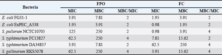 Fig. 3. Inhibitory effects of FPO and FC on pathogenic bacteria. Table 5. MIC (mg/ml) and MBC (mg/ml) of FPO and FC against pathogenic bacteria.