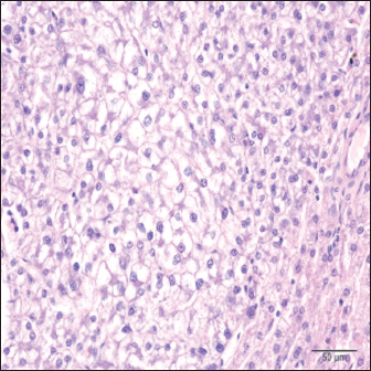 ABSTRACTBackground: Hepatobiliary tumors are uncommon in dogs, and metastatic liver tumors are diagnosed more frequently than primary liver tumors. Hepatocellular carcinoma is the most prevalent primary liver malignant tumor. Case Description: An 11-year-old spayed female Tibetan Terrier was referred to the University of Sarajevo Veterinary Teaching Hospital due to recurrent painful urination attempts, straining urination, hematuria, and decreased appetite. Abdominal ultrasonography revealed a moderately distended bladder containing urolith, bladder wall thickening, and sediment. Incidentally, a hyperechoic hepatic mass on the left medial liver lobe and hepatomegaly were detected along with gallbladder sludge. Surgical cystolithotomy and partial liver lobectomy were performed. Histopathological examination confirmed the hepatic mass as clear cell hepatocellular carcinoma (CCHCC). Conclusion: Although this rare histological subtype has been documented, its biological behavior and clinical features remain poorly understood due to the scarcity of cases. A recent publication by Jung et al. (2021). described the first cytological, histological, and clinical case presentation of CCHCC in dogs, suggesting that obesity and hyperlipidemia may be potential risk factors. However, these proposed risk factors were not detected in the present case, implying that CCHCC in dogs is a rare and poorly understood condition that warrants further attention in veterinary research. Keywords: Clear cell hepatocellular carcinoma, Dog, Case report. IntroductionHepatobiliary neoplasia is relatively uncommon in dogs, accounting for approximately 0.6%–1.3% of all cancers diagnosed through necropsy studies. Tumors of the hepatobiliary system can originate either as primary tumors arising from the liver, gallbladder, or bile ducts or secondary tumors originating from other organs and subsequently metastasizing to the liver. Notably, in dogs, metastatic liver tumors are more frequently diagnosed than primary tumors (Selmic, 2017). Hepatocellular carcinoma (HCC) is the most prevalent primary malignant liver tumor in dogs. It originates from hepatocytes and exhibits diverse biological and morphological characteristics. The classification of HCC in dogs is crucial for understanding its pathogenesis, guiding clinical management, and predicting prognosis. Unlike in humans, where HCC is often associated with predisposing conditions such as hepatitis or cirrhosis, canine HCC typically arises spontaneously, with no discernible association with underlying liver diseases (Liptak et al., 2004; Leela-Arporn et al., 2019). Canine HCC is generally categorized into three primary forms based on gross morphology: massive, nodular, and diffuse. The massive form is the most prevalent and frequently manifests as a solitary, large, well-defined mass, predominantly localized to a single liver lobe. This form is associated with the most favorable prognosis owing to the feasibility of surgical resection. Nodular HCC is characterized by multiple distinct tumors affecting multiple lobes, while the diffuse form involves extensive infiltration throughout the liver parenchyma and is associated with poor prognosis due to limited treatment options and aggressive behavior (Patnaik and Hurvitz, 1980) HCCs exhibit a highly variable histological appearance influenced by distinct cellular arrangements. The four primary histological variants were trabecular, pseudoglandular, scirrhous, and solid. In certain instances, most neoplastic hepatocytes may manifest prominent cytoplasmic clearing or vacuolation, leading to the designation of these neoplasms as clear cell hepatocellular carcinomas (CCHCCs) (Liptak et al., 2004; Cullen, 2017). Although this rare histological subtype has been documented, its biological behavior and clinical features remain poorly understood due to the scarcity of cases (Jung et al., 2021). Recent advancements in molecular biology and cell line development have significantly expanded our understanding of the histopathological diversity of HCC in dogs. Lee et al. (2024) established six canine HCC cell lines and demonstrated the variability in tumor architecture and genetic profiles, which may correlate with histopathological patterns. Nevertheless, gaps remain in the literature, particularly regarding rare variants such as CCHCC. Case DetailsAn 11-year-old spayed female Tibetan Terrier was referred to the University of Sarajevo Veterinary Teaching Hospital with stranguria, hematuria, and inappetence. The dog’s medical history included severe atopic dermatitis (AD) since the age of four, which was managed according to current recommendations for long-term control of AD, including allergen avoidance, skin barrier care, and systemic therapies based on the severity of clinical signs (Miller et al., 2023). On clinical examination, the patient was alert and cooperative, with a body condition score of 5/9. Frequent attempts to urinate were observed, accompanied by signs of discomfort. Abdominal palpation revealed a tense and distended bladder. Radiography revealed no significant findings, while abdominal ultrasonography (Fig. 1) revealed a moderately distended bladder containing a hyperechoic urolith, sediment, and a thickened bladder wall. Hepatomegaly was detected with a hyperechoic lesion on the left medial liver lobe, alongside echogenic gallbladder sludge (Fig. 2). All other abdominal organs were normal. Hematology revealed lymphopenia (0.97 × 10^9/l), and biochemical analysis showed hypophosphatemia (0.70 mmol/l) and elevated liver enzyme levels (ALKP 266 U/l, GGT 22 U/l). Other parameters were within normal limits. Urinalysis was performed, revealing dark brown, turbid urine with a specific gravity of 1.034, pH of 6.5, protein of 500 mg/dl, and erythrocytes 500 Ery/μl. Following diagnostic evaluation, surgical cystolithotomy and partial lobectomy of the left medial liver lobe were performed (Fig. 3).