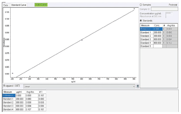 Fig. 2. Calibration curve for the spectrophotometric determination of protein concentration in crude somatic extracts of adult Paramphistomidae parasites using the Bradford method. Sodium dodecyl sulphate-polyacrylamide gel electrophoresisProtein extracts were analysed by SDS-PAGE as described by Cabrera et al. (2020) and Alonso et al. (2020) with slight modifications. A 12% resolving gel (30% acrylamide solution, acrylamide 29.2 g, bisacrylamide 0.8 g; 1.5M TRIS buffer, pH 8.8, 5.6 ml; distilled water 3.1 ml; 10% SDS 150 µl; 10% ammonium persulfate 100 µl; TEMED 40 µl) and a 5% (30% acrylamide solution 1.7 ml; 0.5M TRIS buffer, pH 6.8, 1.25 ml; distilled water 7.03 ml.; 10% SDS 100 µl.; 10% ammonium persulfate 150 µl.; TEMED 30 µl) concentration gel was prepared. Proteins were denatured at 95°C for 5 minutes in a water bath (Techne, Tempette TE-10D, UK), then prepared in a 1:1 ratio with sample buffer. Subsequently, A running buffer of pH 8.8 was used (TRIS Base 3.03 g, glycine 14.42 g, SDS 1 g, distilled water 1,000 ml), 10 μl of the broad-spectrum protein marker Spectra™ Multicolor (Thermo Scientific, USA), and 29 μl of each sample were loaded into the corresponding well. Additionally, 29 μl of bovine albumin at a concentration of 250 µg/ml, with a molecular weight (MW) of ~ 66.5 kDa, was used as a control (Spinreact®, Spain). The electrophoretic run was carried out using the vertical gel electrophoresis system (Labnet International Inc, ENDURO™ VE10, USA) at a constant voltage of 50 V for 30 minutes for the concentration gel and at 120 V for 2 hours and 50 minutes for the resolution gel. Silver stainingGel staining was performed with the commercial Silver Stain Plus™ kit (Bio-Rad, USA), following the manufacturer’s specifications. Molecular weight determinationThe somatic protein bands obtained on the gel were analysed to establish their MW according to the methodology described by (Matsumoto et al., 2019). Then, the relative mobility value (Rf) of the standard marker bands and each problem band was calculated in relation to the migration distance of the dye front: Rf= protein migration distance (cm) ÷ gel front migration distance (cm) Subsequently, the MW of the standard protein marker were plotted on a base ten logarithmic scale as a function of relative mobility (log10 MW versus Rf), and the regression equation was generated as follows: y= mx + b. Finally, the Rf -value of the protein of interest was interpolated in the obtained equation to determine its approximate MW. SequencingTwo adult parasites were randomly selected for molecular identification. polymerase chain reaction products were sent to the Genomics Laboratory of the Directorate of Genetic Resources and Biotechnology of the National Institute of Agricultural Innovation-INIA (Lima, Peru), and bidirectional sequencing was performed using the Sanger method (3,500 Series Genetic Analyzer Biosystem Applied). Statistical analysisStatistical analysis was performed using Graph Pad Prism 9.3.1 software (Prism Software, Irvine, CA, USA). The Kolmogorov–Smirnoff test demonstrated the data’s normality. Analysis of variance tests followed by a t-test were used to compare groups. To compare MW with the band frequency of parasites. Statistical differences were considered significant when the p-value was less than 0.05. Ethical approvalThe research was not submitted to an ethics committee for animal experimentation because the human-animal interaction was only limited to the extraction of samples of adult parasites from the rumen and reticulum of already benefited animals after inspection by well-trained veterinarians from the Faculty of Veterinary Sciences of the National University of Cajamarca, Peru. ResultsTaking into account the little information on the characterization of the parasite in the area, it was necessary to include some morphometric identification parameters reported by Torrel and Paz (2015), for its identification in slaughtered cattle, such as its location in the rumen, the pink or bright red colour, the conical shape with concave ventral face and convex dorsal face, the approximate size of 4–15 mm long by 2–5 mm wide, and the presence of an oral sucker and a sucker in the back surrounded by a bulge. The presence of an oral sucker and a sucker in the posterior part surrounded by a protuberance, having isolated 630 parasites isolated in an aseptic way. Morphological identification of the 630 parasites collected aseptically and preserved in PBS (pH 7.2, 37°C) was mainly located in the rumen of slaughtered cattle, which were pink or bright red in colour, conical in shape with a concave ventral face and a convex dorsal face, and were approximately 4–15 mm long by 2–5 mm wide; they also had an oral sucker and a sucker on the back surrounded by a protuberance (Cabrera et al., 2020). Four concentrations of somatic extract (1: 500 µg/ml, n=10; 2: 726.5 µg/ml, n=20; 3: 1,979.5 µg/ml, n=30 and 4: 2,000 µg/ml, n=50) were evaluated by liquid nitrogen (−195°C) for better expression and separation of protein bands by SDS-PAGE electrophoresis, showing that concentration 2 showed 21 protein bands compared to the other protein concentrations. The somatic crude extract was obtained using liquid nitrogen (−195°C), having achieved four working concentrations with a different number of parasites, which allowed the identify the appropriate concentration for better expression and separation of protein bands by SDS-PAGE technique; these samples were analysed through the colorimetric technique for protein quantification (595 nm), so we had in concentration 1: 500 µg/ml (n=10), concentration 2: 726.5 µg/ml (n=20), concentration 3: 1,979.5 µg/ml (n=30) and concentration 4: 2,000 µg/ml (n=50). In this context, by means of the SDS-PAGE method with silver staining, it was observed that the number of protein bands of the paramphistomid somatic crude extract varied according to the concentration of t
