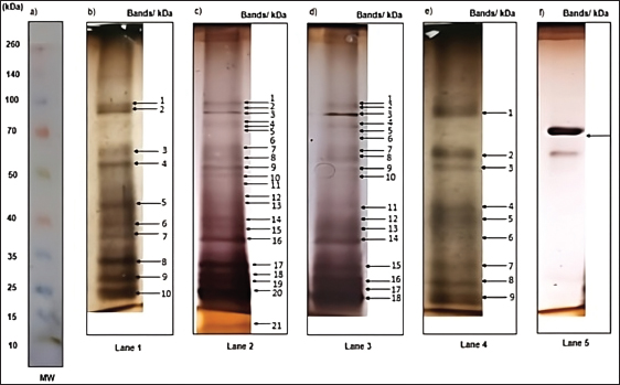 Fig. 3. Silver-stained somatic protein profile of different numbers of adult paramphistomids analysed by SDS-PAGE and their corresponding protein concentration. MW presents the molecular weight standards; lane 1 (500 µg/ml, n=10); lane 2 (726.5 µg/ml, n=20); lane 3 (1,979.5 µg/ml, n=30); lane 4 (2,000 µg/ml, n=50) and lane 5 (bovine albumin 250 μg/ml). Full-length gels are presented in Supplementary Figures: 1 (a); 2 (b, e); 2 (c, f) and 2 (d). Band intensity reflects the relative abundance or concentration of the protein present at a specific molecular weight. Regarding the intensity of the protein bands in the polyacrylamide gel of the different concentrations of paramphistomid somatic crude extract used, 7 protein bands were observed with MWs ranging from 21 kDa–105 kDa (105, 63, 33, 26, 24, 23, and 21 kDa). In addition, 2 protein bands were shown at the four concentrations used with MWs of 63 kDa and 105 kDa respectively; while 3 bands were expressed at concentration 2 (726.5 µg/ml) and 3 (1,979.5 µg/ml), with a MW of 33 kDa, 26 kDa and 24 kDa, thus only the bands with low MW of 23 kDa and 21 kDa resulted from concentration 2 (726.5 µg/m,) (Fig. 4).