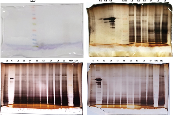 Fig. 1. MW. Molecular weight standards in the range of 10–260 kDa. (Lane 1, Lane 4). Silver-stained somatic protein profile of different numbers of adult paramphistomids analyzed by SDS-PAGE. L1 (n=10 paramphistomids/500 μg/ml); L2 (n=20 paramphistomids/726.5 μg/ml); L3 (n=50 paramphistomids); L4 (n=10 paramphistomids, different sample); L5 and L6 (n=20 paramphistomids, different sample); C1 (bovine albumin 125 μg/ml); C2 (bovine albumin 250 μg/ml); C3 (bovine albumin 500 μg/ml); MW represents molecular weight standards. L1 (500 μg/ml, lane 1 in Fig. 1) and L3 (2,000 μg/ml, lane 4 in Fig. 1). (Lane 2, Lane 5) Perfil proteico somático teñido con plata de 20 paramphistomidos adultos analizados mediante SDS-PAGE. L1-L10 (n=20 paramphistomidos, muestras diferentes), C (albúmina bovina), MW presenta los estándares de peso molecular. L7 (726.5 μg/ml, carril 2 en Fig. 2) y C (250 μg/ml, carril 5 en Fig. 1). (Lane 3) Silver-stained somatic protein profile of 20 and 30 adult paramphistomids analyzed by SDS-PAGE. L1-L7 (n=20 paramphistomids, different samples), L8-L10 (n=30 paramphistomids, different samples), C (bovine albumin 500 μg/ml), MW shows molecular weight standards. L9 (1979.5 μg/ml, lane 3 in Fig. 1). | ||