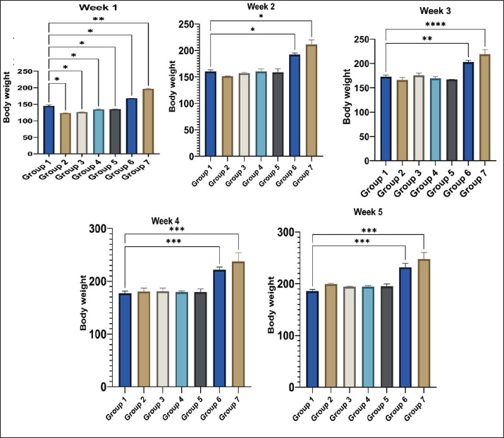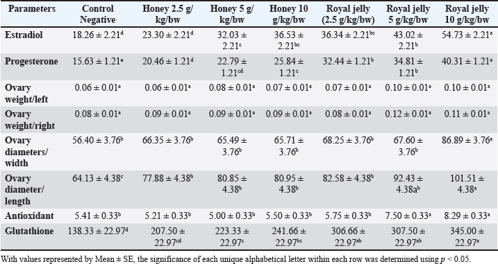 Fig. 4. The chart presented the role of honey and royal jelly in body weight in male rats. The present results demonstrated that honey and RJ increased the production of testosterone with androgen levels and improved sperm number, normal maturation, intact morphology, and motility, which could be due to the fact that honey and RJ mainly include proteins, sugars, lipids, vitamins, polyphenols, flavonoids, and free amino acids. According to research conducted in Iran, honey’s antioxidant qualities may be the reason for improving sperm motility, testosterone hormone levels, and seminiferous tubule diameters at doses of 1.2 and 1.8 g/kg bw (Mohammed, 2014; Hadi, 2017). The amino acid, vitae, and short-chain fatty acids unique to RJ, particularly 10-HDA, which is present in our RJ, may improve sperm motility and morphology in the present study, similar to previous data (Comhaire et al., 2000; Abdelhafiz and Muhamad, 2008). Moreover, rats given 0.2, 1.2, and 2.4 g/kg of Malaysian honey for 4 weeks showed increases in sperm count (Mohamed et al., 2012). The testicular weight, sperm count, testosterone hormone, and GSH level all increased after receiving 1 g/kg bw of Egyptian RJ for a month. The percentage of sperm deformities also decreased (Hassan, 2009). When fed 50, 100, or 150 mg of Chinese RJ /kg twice a week, rabbits’ sperm concentration, total sperm output, sperm motility, live sperm, and normal sperm all increased significantly (p < 0.05) during a 20-week period. Vitamins and amino acids were thought to have played a role in this rise (El-Hanoun et al., 2014). Although Iranian RJ (100 mg/kg bw) increases testicular weight, sperm count, motility, viability, and serum testosterone levels, it also appears to decrease sperm abnormalities. Its antioxidant properties might be enhanced by the addition of vitamins E and C (Ghanbari et al., 2015). Table. 3. Impact of honey and royal jelly on hormone, ovary measurements, and antioxidant parameters in female groups.