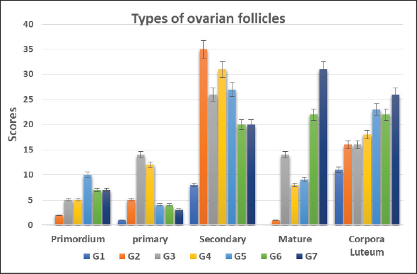 Fig. 5. Effects of honey and royal jelly on folliculogenesis. The current result, regarding the morphology of the testis, was normal even in the high-dose groups. Similarly, sperm morphology remained intact and was influenced by high-dose honey and RJ, in agreement with a previous study that documented that 800 mg/kg RJ preserved the morphology of the testis and sperm (Yang et al., 2012). Since it has been demonstrated that an increase in the number of aberrant sperm contributes to a decrease in plasma testosterone levels, our hypothesis might be that rising progesterone levels impact sperm shape (Karacal and Aral, 2008).