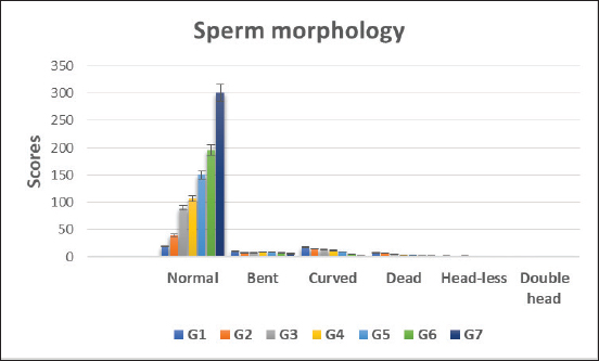 Fig. 7. Role of honey and royal jelly on sperm morphology. ConclusionSupplementation with honey and RJ speeds up the beginning of puberty, increases follicular growth, and promotes sperm viability and counts. Increased antioxidant potential and androgen, testosterone, progesterone, and estradiol activity in the reproductive system are linked to improved reproductive performance. According to this study, honey and RJ may be a novel additional supplement that could improve reproductive metrics and be a successful future treatment for infertility is premature. AcknowledgmentsThe University of Sulaimani’s College of Veterinary Medicine and Agriculture Science in Sulaymaniyah, Iraq, supported this effort. No agencies or organizations are involved in this initiative. Conflicts of interestThe authors declare no conflict of interest. FundingThere is no funding for this project. Authors’ contributionsDMA and RJR with SMAH were used to design the research. RJR data analysis, DMA, and SMAH wrote the manuscript. The manuscript has been revised by AMAH. The final manuscript has been read, corrected, and approved by all authors. Data availabilityThis article contains all of the data created or examined in this investigation. ReferencesAbdelhafiz, A.T. and Muhamad, J.A. 2008. Midcycle pericoital intravaginal bee honey and royal jelly for male factor infertility. Int. J Gynaecol. Obstet. 101(2), 146–149. Akang, E.A., Oremosu, O. and Dosumu, C. 2010. The effect of fluted pumpkin (telferia occidentalis) seed oil (fpso) on testis and semen parameters. Agric. Biol. J. North Am. 1(4), 697–703. Aksoy, E., Aktan, T.M. and Duman, S. 2012. Assessment of spermatozoa morphology under light microscopy with different histologic stains and comparison of morphometric measurements. Int. J. Morphol. 30(4), 1544–1550. Almog, B., Gold, R. and Tajima, K. 2001. Leptin attenuates follicular apoptosis and accelerates the onset of puberty in immature rats. Mol. Cell. Endocrinol. 183(1–2), 179–191. Alvarez-Suarez, J.M. 2017. Bee products-chemical and biological properties. Berlin: Springer. Al-Waili, N.S., Al-Waili, F.S. and Akmal, A. 2014. Effects of natural honey on polymicrobial culture of various human pathogens. Arch. Med. Sci. 10(2), 246–250. Badkoobeh, P., Parivar, K. and Kalantar, S.M. 2013. Effect of nano-zinc oxide on doxorubicin-induced oxidative stress and sperm disorders in adult male wistar rats. Iran. J. Reprod. Med. 11(5), 355. Baloš, M.M.Ž., Popov, N.S. and Radulović, J.Z.P. 2020. Sugar profile of different floral origin honeys from serbia. J Apicu. Res. 59(4), 398–405. Banihani, S.A. 2019. Mechanisms of honey on testosterone levels. Heliyon 5(7), e02029. Becerril-Sánchez, A.L. Quintero-Salazar, B. Dublán- García, O. and Escalona-Buendía, H.B. 2021. Phenolic compounds in honey and their relationship with antioxidant activity, botanical origin, and color. Antioxidants 10(11), 1700. Bogdanov, S. 2011. Royal jelly, bee brood: composition, health, medicine: a review. Lipids. 3(8), 8–19. Budin, S.B., Jubaidi, F.F., Azam, F.M.N., Yusof, N.L.M., Taib, I.S. and Mohamed, J. 2017. Kelulut honey supplementation prevents sperm and testicular oxidative damage in streptozotocin- induced diabetic rats. J. Teknologi. 79(3), 9674. Comhaire, F., Christophe, A., Zalata, A., Dhooge, W., Mahmoud, A. and Depuydt, C. 2000. The effects of combined conventional treatment, oral antioxidants and essential fatty acids on sperm biology in subfertile men. Prostaglandins Leukot. Essent. Fatty Acids 63(3), 159–165. Cornara, L., Biagi, J., Xiao, M. and Burlando, B. 2017. Therapeutic properties of bioactive compounds from different honeybee products. Fron. Pharmacol. 8, 412. El-Desoky, N., Hashem, A., Elkomy, N. and Abo-Elezz, Z. 2017. Physiological response and semen quality of rabbit bucks supplemented with moringa leaves ethanolic extract during summer season. Animal. 11(9), 1549–1557. El-Hanoun, A., Elkomy, A., Fares, W. and Shahien, E. 2014. Impact of royal jelly to improve reproductive performance of male rabbits under hot summer conditions. World Rabbit Sci. 22(3), 241–248. Eva, C. 2000. Honey a comprehensivesurvey. London: International Bee Research Association. p: 60. Firouzabadi, M., Pourramezani, N., and Balvardi, M. 2020. Comparing the effects of yarrow, honey, and breast milk for healing nipple fissure. Iran. J Nurs. Midwifery Res. 25(4), 282–285. Ghanbari, E., Khazaei, M.R., Khazaei, M. and Nejati, V. 2017. Royal jelly promotes ovarian follicles growth and increases steroid hormones in immature rats. Int. J. Fertil. Steril. 11(4), 263. Ghanbari, E., Nejati, V., Najafi, G., Khazaei, M. and Babaei, M. 2015. Study on the effect of royal jelly on reproductive parameters in streptozotocin- induced diabetic rats. Int. J. Fertil. Steril. 9(1), 113. Hadi, I.H. 2017. Effect of honey on sperm characteristics and pregnancy rate in mice. Bull. Iraq Natl. History Museum 14(3), 223–233. Hashem, N.M., Gonzalez-Bulnes, A. and Simal- Gandara, J. 2020. Polyphenols in farm animals: source of reproductive gain or waste? Antioxidants 9(10), 1023. Hassan, A. 2009. Effect of royal jelly on sexual efficiency in adult male rats. Iraqi J Vet. Sci. 23. Husein, M. and Kridli, R. 2002. Reproductive responses following royal jelly treatment administered orally or intramuscularly into progesterone-treated awassi ewes. Anim. Reprod. Sci. 74(1–2), 45–53. İzol, E., Yapıcı, İ. and Gülçin, İ. 2023. 10-hydroxy-2- decenoic acid (10-hda) and bioactive components in royal jelly. Biological Activities of Honeybee Products, ed. İzol E., Haspolat YK, Gülçin İ. Orient Publications, pp: 1–9. Karacal, F. and Aral, F. 2008. Effect of the royal jelly on sperm quality in mice. Indian Vet. J. 85(3), 331– 332. Khazaei, M., Ansarian, A. and Ghanbari, E. 2018. New findings on biological actions and clinical applications of royal jelly: a review. J Diet. Suppl. 15(5), 757–775. Liu, X.C., Jiang, Y., Chen, F., Shi, C., Lai. and 