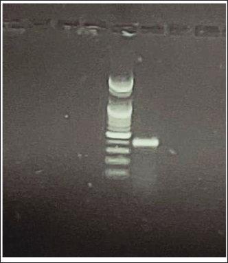 Fig. 1. Positive sample for CNGV. Biochemical analysisLiver enzymes: Table 1 presents the serum levels of liver enzymes. No significant difference (p > 0.05) was observed in ALT activity among the control, PCR-positive, and PCR-negative groups. In contrast, a statistically significant difference (p ≤ 0.05) was found in AST activity between these groups. Table 1. Liver enzyme (ALT and AST) in blood of infected common carp.