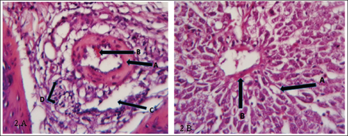 Fig. 2. (a) Histopathological section of liver of common carp showing fibrosis (A), hemorrhage(B), edema (C) inflammatory cells infiltration (D). H&E ×40.; (b) Histopathological section of the liver of common carp appear degeneration (A) and fibrosis (B). H&E ×20.