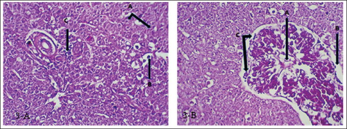 Fig. 3. (a) Histopathological section of liver of common carp showing severe necrosis (A) with fatty degeneration (B) and infiltration of inflammatory cells (C). H&E ×20.; (b) Histopathological section of liver of common carp showing necrosis in the bile duct (A) and edema surrounded the bile duct (B) with mononuclear cells infiltration (C). H&E ×20. Kidney:
