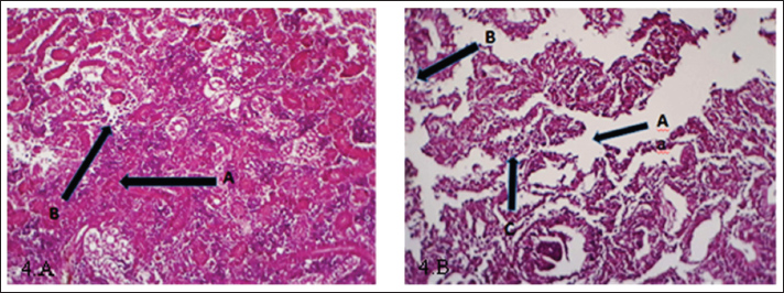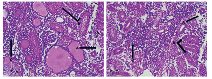 Fig. 4. (a) Histopathological section of kidney of common carp showing damage of glomeruli and tubules (A), inflammatory cells infiltration (B). H&E ×20.; (b) Histopathological section of kidney of common carp showing edema (A) and sloughing (B) inflammatory cells infiltration (C). H&E ×10.