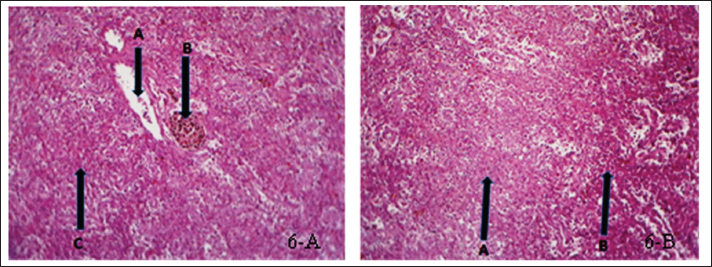 Fig. 6. (a) Histopathological section of spleen of common carp showing edema (A), hemosidrein (B) and damage in red pulp (C). H&E ×10.; (b) Histopathological section of spleen of common carp showing damage in red pulp (A) and inflammatory cells infiltration (B). H &E ×10.