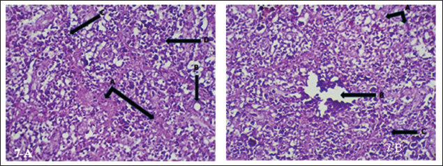 Fig. 7. (a) Histopathological section of spleen of common carp showing necrosis (A), vacuolation (B) apoptosis (C) and hemosiderin precipitation (D). H&E ×20.; (b) Histopathological section of spleen of common carp showing necrosis (A), edema (B) and inflammatory cells infiltration (C). H&E ×20. Intestine: