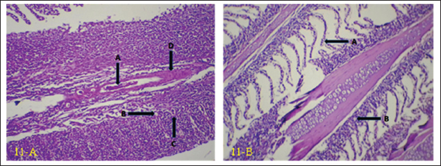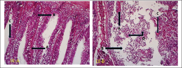 Fig. 8. (a) Histopathological section of intestine of common carp showing inflammatory cells infiltration (A), thickening in lamina properia (B) and vacuolation (C). H&E ×10.; (b) Histopathological section of intestine of common carp showing shortening in lamina properia (A) and inflammatory cells infiltration (B). H&E ×10.