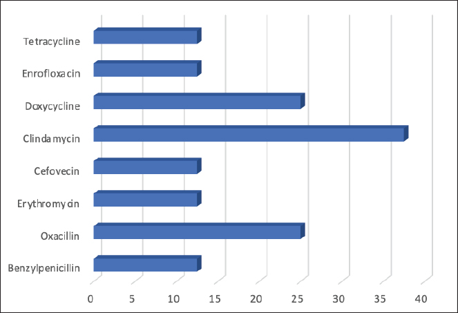 Fig. 1. Frequency of antimicrobial resistance of strains of Staphylococcus spp. (8) isolated from dogs with otitis externa. Table 4. Epidemiological variables of patients according to Staphylococcus isolation.