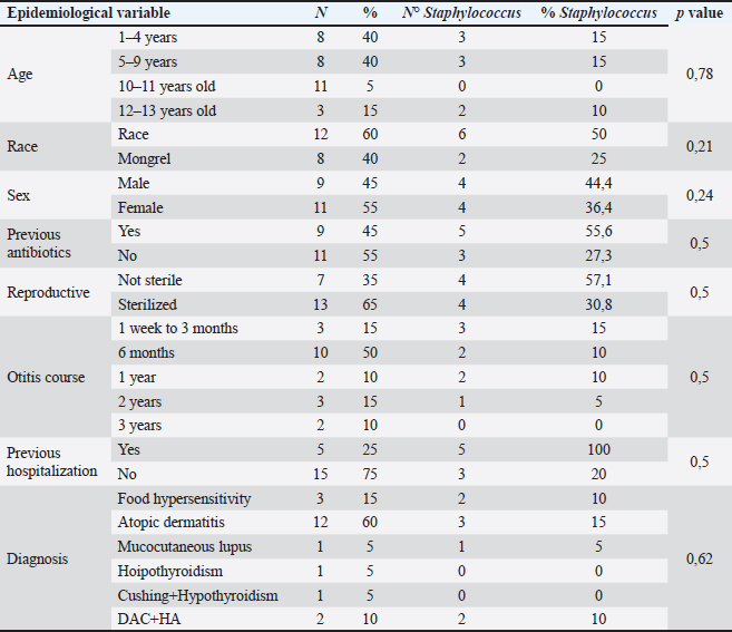 AbstractBackground: Otitis frequently affects dogs. Underlying diseases and predisposing factors affect the otic environment, thereby causing bacterial proliferation. One of the most isolated species in cases of otitis is the Staphylococcus genus, which has widely reported antimicrobial resistance profiles. This has not yet been studied in Talca, Chile. Aim: The objective of this study was to determine the existence of antimicrobial resistance in Staphylococcus strains isolated from the external auditory canal of a group of dogs diagnosed with otitis externa in Talca, Chile. Methods: Samples were taken from the external ear canal of 20 dogs with otitis externa from October 2023 to August 2024 at dermatological consultations in the city of Talca. The samples were transported to be processed and analyzed in the MICROVET Veterinary Microbiology laboratory, of the Faculty of Veterinary and Livestock Sciences of the University of Chile, using VITEK® 2 equipment for the identification and determination of antimicrobial susceptibility. The association between the epidemiological variables of the patients and the antimicrobial susceptibility of Staphylococcus strains was determined. Results: Staphylococcus spp. isolation was obtained in 8 samples, 62.5% of which were strains of the coagulase-positive Staphylococcus group, of which 25% were identified as Staphylococcus aureus and 37.5% as Staphylococcus pseudintermedius. The remaining 37.5% were coagulase-negative Staphylococcus strains, which were identified as Staphylococcus chromogenes (12.5%), Staphylococcus simulans (12.5%), and Staphylococcus lentus (12.5%). 50 % of the isolates were resistant, with Staphylococcus pseudintermedius being MDR, with resistance to 6 antibiotics, and S. lentus resistant to 5, both of which were also MRS. There was no association between the epidemiological variables of the patients and the antimicrobial susceptibility of the Staphylococcus strains. Conclusion: These preliminary results are the first report in Chile demonstrating the presence of methicillin-resistant Staphylococcus in a group of dogs with otitis externa in Talca, Chile, South America using VITEK®. These results are relevant from a public health perspective given the close contact between owners, veterinarians, and dogs with otitis externa. These preliminary data contribute to the local understanding of this global phenomenon and provide information to support the theoretical framework for future local studies on epidemiological surveillance. Keywords: Antimicrobial resistance, Dog, otitis externa, Staphylococcus.. IntroductionCanine otitis externa is defined as inflammation of the external ear canal and is a common clinical disorder of complex multifactorial etiology affecting 10%–20% of canines (Scott et al., 2001; O’Neil et al., 2021; Li et al., 2023). The most common primary causes are allergic-based pathologies, such as atopic dermatitis, food allergy (Griffin and DeBoer, 2001), and endocrine diseases, such as hypothyroidism (Rosser, 2004). These factors together with predisposing factors generate a microenvironment that favors the proliferation of secondary organisms such as yeasts and bacteria in the external ear canal (Rosser 2004, Kwon et al., 2025). Of the latter, species of the genus Staphylococcus are recognized as important bacteria of the skin and mucous membranes, including the outer ear (Zamankhan-Malayeri et al., 2010; Know et al., 2025). Members of this genus Staphylococcus are classified as coagulase-positive Staphylococcus (CPS) and coagulase-negative Staphylococcus (CoNS), and they are reported as the main causative agents of numerous infections in animals and human patients worldwide (Malik et al., 2005; Morris and Cole, 2023). A significant number of cases may evolve into chronic or recurrent otitis, which is much more difficult to resolve clinically. These continuous cycles of infection and inflammation lead to pathological changes in the ear. In addition to the above, the use of treatments with different families of antimicrobials, without the result of complementary laboratory tests such as susceptibility tests, by veterinarians allows the selection of antimicrobial-resistant strains (Galarce et al., 2021). Thus, methicillin-resistant Staphylococcus spp. (MRS), generally associated with the mecA gene, are microorganisms resistant to antibiotics β-lactamic, carbapenems, and quinolones (Siddiqui and Koirala, 2020). Some of these antimicrobials are frequently administered in the veterinary medicine of companion animals, as pointed out by Galarce et al. (2021), where dogs could be carriers of MRS strains, which is a risk factor, affecting not only pet guardians but also veterinarians (De Martino et al., 2016). Susceptibility to Staphylococcus antimicrobials in canine otitis externa has not yet been studied in Talca, Chile (35°25ʹS, 71°39ʹW), a rural South American city characterized by a temperate Mediterranean climate, with an average rainfall of 475 and 29 mm in winter and summer, respectively, and an average temperature of 18.8° Celsius. (Thomson et al., 2022). The acquisition of these data will contribute to the local understanding of antimicrobial susceptibility in Staphylococcus strains in canine otitis externa, contributing to the understanding of a global phenomenon of interest to public health. The objective of this study was to determine the existence of antimicrobial resistance in Staphylococcus strains isolated from the external auditory canal of a group of dogs diagnosed with otitis externa in Talca, Chile. Material and MethodsInclusion criteriaTwenty canine patients of any breed and sex were included in this study and were referred to dermatological interconsultation at Dermatovet Veterinary Clinic, located in the city of Talca. The sampled patients had signs of otitis externa, such as inflammation of the external pinna, pruritus, erythema, scabs, ear discharge, and rancid odor (Cabañes, 2021), and 