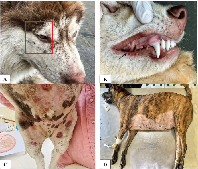 Fig. 1. Clinical symptoms of H. canis infection in dogs. (A) Tick infestation in dogs infected with H. canis; (B) subcutaneous hemorrhage and pale mucous membranes in dogs infected with H. canis; (C) skin lesions in the abdominal region that are hemorrhagic; (D) fever and respiratory distress in dogs. Table 2. First report of H. canis infection in dogs and wolves in Can Tho: Clinical and epidemiological characteristics.