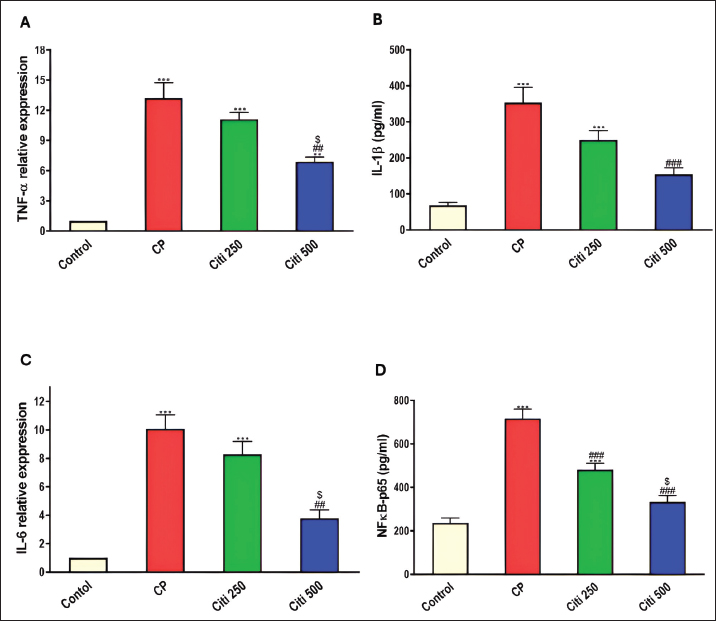 Fig. 4. Impact of citi on CP-induced alteration of proinflammatory cytokines and NF-kB: The impact of oral daily citi treatment (250, 500 mg/kg) for 14 days with a single i.p. injection of CP (200 mg/kg) on day 7 on: A. Relative mRNA expression of TNF-α in lung tissue; B. Relative mRNA expression of IL-6 in lung tissue; C. IL-1B level in BALF; D. NF-kB level in BALF. The mean ± SEM is used to express data. n=6. ***p < 0.001, ** p < 0.01 versus the control; ### p < 0.001, ## p < 0.01 versus the CP group; $ p < 0.05 versus the citi 250 group. CP: cyclophosphamide, citi: citicoline, TNF-α: tumor necrosis factor-α, IL-6: Interleukin-6, IL-1B: Interleukin-1B, NF-kB: nuclear factor kappa B, BALF: bronchoalveolar lavage fluid. Citi ameliorated CP-induced elevation of NLRP3 and caspase-1Furthermore, rats in the CP group exhibited a notable increase in caspase-1 activity and NLRP3 levels (Fig. 5) compared with healthy rats in the control group. However, citi treatment significantly reduced the activity of caspase-1 and the content of NLRP3, with the higher dose group showing the most pronounced effect. Citi improved CP-induced lung injuryAs indicated in Figure 6, histopathological analysis of the rat lungs revealed that CP administration caused thickening of the alveolar walls, along with significant infiltration of inflammatory cells, hemorrhage, and congestion. Additionally, alveolar emphysema, arterial hypertrophy, and inflammatory cells infiltration around the blood vessels and bronchi were observed. However, citi treatment dose-dependently reduced the harmful effects of CP. DiscussionCP is a highly effective cancer chemotherapeutic agent; however, it is also one of the most toxic agents, leading to lung toxicity and other pathological complications (Bhattacharjee et al., 2015). The primary mechanism of CP toxicity is the toxic metabolite acrolein, which induces cellular apoptosis, promotes oxidative stress, and triggers inflammation, resulting in widespread organ damage. This study aimed to explore whether citicoline can alleviate lung injury caused by CP and, if so, how it exerts its protective effects. For the first time, we have presented compelling evidence supporting the therapeutic potential of citi in mitigating pulmonary damage. In our study, inflammatory infiltration of cells and emphysema, which are associated with macrophage activation, were most prevalent in the CP-treated group. Inflammatory cells move more quickly from the blood vessels into the alveolar cavities as a result of this activation. Protein-rich pulmonary edema results from cell activation, which damages the alveolar-capillary membrane and increases the accessibility of the lung vasculature (Kim et al., 2014; Ali et al., 2023). This was demonstrated by the increased lung weight-to-body weight ratio and high protein levels in BALF (El-Kashef and Rahim, 2023). Furthermore, the activity of LDH in the BALF was markedly higher in the CP group, indicating cell damage and death.