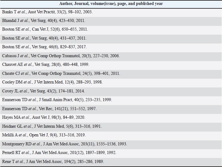ABSTRACTBackground: Pathological fractures result from abnormal bone remodeling caused by local bone lesions, such as malignant tumors, compromising bone strength. Tumor-derived factors disrupt the balance between bone resorption and formation, leading to osteolytic and osteosclerotic lesions that weaken bone integrity. While surgical treatments, including limb amputation and limb-sparing surgery, are commonly used, the therapeutic efficacy of fracture repair remains unclear due to limited evidence. Aim: This study characterized pathological fractures and evaluated survival time and functional prognoses following surgical repair in dogs. The goal was to provide robust evidence to inform clinical decision-making and improve treatment outcomes. Methods: A systematic review and meta-analysis were conducted following a PRISMA-compliant approach. MEDLINE (PubMed) and Google Scholar were used to search for relevant studies published from database inception to March 1, 2025. Data from past reports were integrated with cases from our institution, comprising 70 dogs with pathological fractures. Survival and prognosis were analyzed using the Kaplan–Meier method, and outcomes between adjuvant chemotherapy were compared using the log-rank test. Results: Osteosarcoma was the most common cause of pathological fractures (n=55; 78.6%), followed by multiple myeloma, undifferentiated sarcoma, and bone metastases. Surgical stabilization was the most common therapeutic intervention (n=40; 57.1%), with plate stabilization being the most frequently used technique (n=20; 28.6%). The median time to lameness recurrence was 163 days (95% confidence interval [CI]: 130–510 days), while the median survival time with osteosarcoma was 292 days (95% CI: 163–518 days). The subgroup analysis revealed no significant difference in survival between patients who received adjuvant therapy (radiation therapy or chemotherapy) and those who did not (p =0.675). Clinical and statistical heterogeneities were not assessed due to the integration of case reports and case series. Conclusion: Surgical stabilization of pathological fractures resulting from osteosarcoma should be considered a palliative treatment option for cases in which amputation is declined by the owner or in dogs with advanced disease, including metastatic lesions. With appropriate patient selection, this approach may represent a viable third-line treatment following limb-sparing surgery and amputation. Keywords: Fracture repair, Meta-analysis, Osteosarcoma, Palliative treatment, Pathological fracture. IntroductionPathological fractures result from abnormal bone remodeling and are commonly associated with skeletal tumors, including primary and metastatic bone tumors. In normal bone metabolism, bone resorption and formation occur via a balanced process known as coupling. However, tumor-derived secretory factors disrupt this balance in the bone microenvironment, leading to abnormal remodeling (Nakajima et al., 2016a; Nakajima and Raz, 2020; Nakajima et al., 2021). As a result, tumor-induced bone tissue becomes mechanically fragile and unable to withstand external forces effectively. Even minor stresses can induce high stress concentrations at the defective site, increasing the risk of pathological fractures (Nakajima et al., 2016b). Bone tumors can manifest as osteolytic and osteosclerotic lesions, both of which contribute to compromised bone integrity. Bisphosphonates, which induce osteoclast apoptosis, are commonly used to counteract excessive local bone resorption. Surgical treatments for pathological fractures typically involve either amputation or limb-sparing reconstruction of the affected area while preserving as much of the normal bone and spine integrity as possible (van Ee et al., 1989; Heidner et al., 1991; Pernell et al., 1992; Montgomery et al., 1993; Emmerson and Muir, 1997; Cooley and Waters, 1998; Chauvet et al., 1999; Emmerson and Pead, 1999; Banks et al., 2003; Cabassu and Moissonnier, 2007; Bhandal and Boston, 2011; Boston et al., 2011a; Boston et al., 2011b; Boston et al., 2017; Choate and Arnold, 2011; Covey et al., 2014; Hayes et al., 2020; Melilli, 2020). However, due to the limited number of published case reports, the therapeutic efficacy of pathological fracture repair remains unclear, and no comprehensive review on treatment outcomes exists. Clinical decision-making should be based on robust evidence rather than individual case studies. While single studies have inherent limitations, a meta-analysis provides a statistical approach to synthesizing results, offering a more precise and comprehensive assessment of treatment efficacy. By integrating multiple studies, a meta-analysis increases the overall sample size and enhances the strength of the evidence (Page et al., 2021). This large-scale cohort study aims to characterize pathological fractures and address the clinical question of survival time and functional prognosis following surgical repair using meta-analysis. Materials and MethodsTo ensure research quality, we employed a Preferred Reporting Items for Systematic Reviews and Meta-Analyses (PRISMA) compliant protocol to enhance the credibility and confidence of the review methodology. The protocol for this systematic review and meta-analysis has been previously published (Page et al., 2021). Systematic reviewWe surveyed existing studies to address the clinical question: What is the survival duration or functional prognosis following surgical repair of pathological fractures? To identify eligible cases, we reviewed the medical records (2018–2025) of dogs with pathological fractures. Dogs with imaging evidence of a pathological fracture—including radiography, computed tomography, and magnetic resonance imaging—and a confirmed bone biopsy were included. Additionally, eligible canine patients were identified through a comprehensive search of publications on MEDLINE (PubMed) using the search terms “Pathologic fracture,” “Path