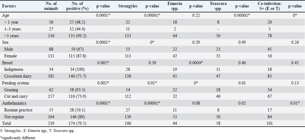 A Pearson chi-square test was conducted using SPSS version 28.0 (IBM Corp., NY, USA), to assess associations between the occurrence of infection, as determined by microscopic identification, and selected parameters: age, sex, breed, feeding system, and anthelmintic use. In addition, multiple regression analyses were conducted to evaluate the simultaneous effects of these variables on each parasite infection status. The analysis was performed using a 95% confidence interval, with a p-value <0.05 considered statistically significant.