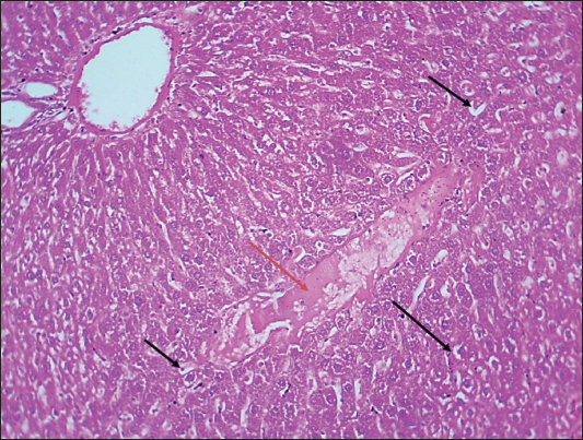 Fig. 4. Histological section of the liver of rats drenched with 0.6 mg/kg citalopram. The section shows a mild degenerative lesion (fatty degeneration, black arrows) with fibrous network formation in parenchyma (red arrow), (H and E stain 100X).