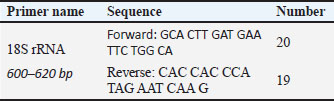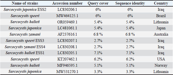 The steps show for amplifying 18S rRNA, detailing each stage of the reaction, including denaturation, annealing, and final extension to ensure amplification. The tubes were placed in a thermocycler to perform the reactions as described (Hamidinejat et al., 2014; Pestechian et al., 2021): Initial denaturation: At 95°C for 6 minutes to disruption the hydrogen bonds in the DNA and separate the strands; Repeated denaturation (35 cycles): Performed at 95°C for 45 seconds. This stage is crucial to keep the strands separated for effective binding; Annealing (Repeats 35 times): After denaturation, the reaction proceeds with annealing at 58°C for 1 minute, allowing the primers to collabrate specifically to their supplementary sequences in use single-stranded DNA; Extension (Repeats 35 times): The extension step follows, where the heat is elevated near 72°C used for 1 minute. At this best heating, Taq polymerase manufactures new DNA strands by increment nucleotides to the primer-bound regions; Final Extension: After completing 35 rotations, an eventual extension next to 72°C used for 5 minutes, assure that any remaining single-stranded DNA is fully extended. This detailed PCR program ensures the efficient amplification of the target 18S rRNA region, facilitating the molecular identification of Sarcocystis spp. Nucleotide sequencing of amplified fragments based on DNA sequencing technologyThe nucleotide sequences of the specimen (Sarcocystis spp.) under study were determined. The PCR products of the aforementioned sampling, along with the primers for the resulting fragment, were sent for sequencing using the Psomagen device in the USA. The gene sequences were compared with documented gene sequences in the National Center for Biotechnology Information (NCBI), and the outcomes were investigated via the BLAST program. Following this, the NCBI BLAST (BLASTn) from NCBI (http://www.ncbi.nlm.nih.gov) was used to compare the sequences with other sequences that were available in GenBank. With MEGA11 software, the Likelihood method on the Tamura-Nei model and bootstrap analysis with 1,000 resamplings. Statistical analysisChi-square tests were calculated using SPSS version 19 to determine the divergence in the pervasiveness of Sarcocystis spp. Variances with a p value <0.05 were measured statistically significant. Ethical approvalEthical approval was gained from the Ethics Committee or the Academic Committee of the Microbiology Department, Veterinary Medicine College, Mosul University, on October 1, 2023. ResultsThe Table 2 shows the infection rate of Sarcocystis spp. in rabbits from Mosul city, categorized by the gender of the rabbits. A whole of 57 rabbits were tested, with 40 rabbits 70.2% testing positive for infection. Table 2. The infection rate with Sarcocystis spp. in rabbits in Mosul city according to the sex of rabbit.