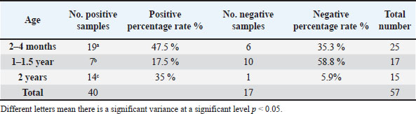 Out of 38 females, 24 were infected, representing an infection rate of 63.1%. While 19 male rabbits, 16 were infected, with a lower infection rate of 84.2%. The table also notes that similar letters indicate no significant variance at the significance level of p < 0.05, meaning that while there are numerical differences between male and female infection rates, they are not statistically significant. This implies that both male and female rabbits in Mosul city are similarly vulnerable to Sarcocystis spp. infection, despite some differences in percentages. Table 3 displays the transmission percentage of Sarcocystis spp. in rabbits from Mosul city according to their age groups. The data includes 40 infected rabbits, with the following age-related infection trends: (2 years old). This group had the highest infection rate, with 14 out of 15 rabbits (93.3%) testing positive. While the group (2–4 months old) showed an infection rate of 76%, with 19 out of 25 rabbits infected. And the lowest infection rate was observed in this group (1–1.5 years old), where 7 out of 17 rabbits (41.1%) were infected. Table 3. The infection rate with Sarcocystis spp. in Mosul city according to the age of rabbit.