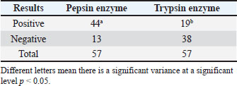 Table 3 indicates a significant variation in infection rates across different age groups, as shown by the different letters (a, b, c, d) associated with each group. The p < 0.05 means that the age of the rabbits significantly influences the likelihood of infection, with older rabbits (2 years) being more prone to infection than younger ones. Table 4 illustrates the results of enzyme digestion and the detection of parasites in rabbit tissues from Mosul city. Pepsin and trypsin enzymes were used to carry out the digestion, and the outcomes indicate a substantial variation in each enzyme’s ability to identify bradyzoites stage of Sarcocystis species in the infected rabbits. Table 4. The tissues digestion with the digestive enzymes.
