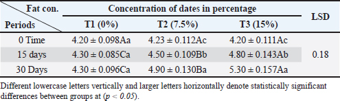 Total solids non-fatTable 6 presents the total solids non-fat content in sheep’s milk, revealing that the findings across various groups exhibited no significant variations in total solids non-fat content in the first period. Treatment groups T2 and T3 exhibited an increase relative to the control group. Moreover, T3 had a significant effect (p < 0.05) compared with the control and T2 groups during the last period, reaching values of (9.90 ± 0.33, 10.01 ± 0.63, and 10.40 ± 0.06) after 30 days, respectively, despite the treated groups exhibiting elevated non-fat values for milk solids. Table 6. Effect of adding crush date to the diet of ewes on the percentage of milk solid non- fat SNF (Mean ± SE).