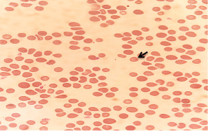 Fig. 1. T. annulata inside erythrocytes (black arrow) in thin blood smears of infected rabbit stained by Giemsa stain (100×).