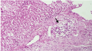 Fig. 10. A histopathological section of liver of (G2) at 21 days postinfection showing necrotic finding in fibrous capsule region (black arrow) with focal inflammatory cell filtration with intact hepatic cords (H&E stain X 40).