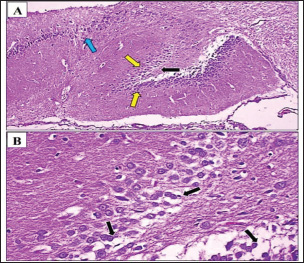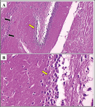 Fig. 3. Photomicrograph of the hippocampus of a Fenchol-treated rat. (A, B) Note the density of granule cells (yellow arrow) was lower in the negative control group than in the positive control group, likely due to neuronal loss in the dentate gyrus of the affected hippocampus. However, the number of granule cells was higher than that in the positive control and Arabic Gum groups. Also, mild neurodegeneration (black arrow) was observed in neurocyte of Cornu Ammonis region 2. H&E. A: 100x and B: 400x Analysis of interleukin-6 (IL-6) levels across the experimental groups revealed significant variations. In the negative control group, IL-6 levels remained within the normal physiological range, indicating the absence of inflammatory responses. In stark contrast, the positive control group exhibited a marked elevation in IL-6 levels, which was statistically significant (p < 0.05) compared to all other groups. This elevation correlates with the observed pathological changes, supporting the pro-inflammatory role of IL-6 in AlCl3-induced neuroinflammation.
