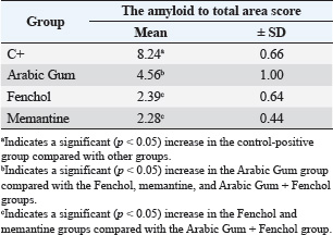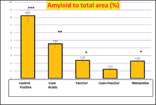 Fig. 4. Amyloid scoring level in the studied groups. *: indicates a significant (p < 0.05) increase in Fenchol and memantine groups compared with the Arabic Gum group. **: indicates a significant (p < 0.05) increase in Arabic Gum compared with Fenchol, memantine, and Arabic Gum Fenchol groups. ***: indicates a significant (p < 0.05) increase in control-positive group compared with other groups.