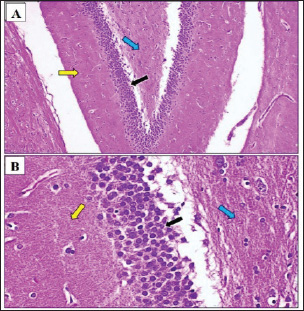 Fig. 6. Photomicrograph of the hippocampus of control negative rat. (A, B) Normal histological architecture of the dentate gyrus area of the hippocampus. Note the molecular stratum (yellow arrow), granulosum stratum (black arrow), and polymorphic layer (blue arrow). H&E. A: 100× and B: 400×.