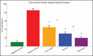 Fig. 7. The standard curve generated from the ELISA technique for measuring IL-6 concentrations. The curve illustrates the relationship between known IL-6 concentrations and the optical density (OD) values, allowing for the quantification of IL-6 levels in experimental samples. The data points represent the average of triplicate measurements, and the curve was fitted using linear regression. In the Gum Arabic-treated group, IL-6 levels were notably reduced compared with those in the positive control group, although they remained slightly elevated relative to those in the negative control group. The Fenchol-treated group demonstrated a moderate regulatory effect, with a pronounced and statistically significant reduction in IL-6 levels compared with the positive control group (p < 0.05), suggesting a stronger anti-inflammatory action.