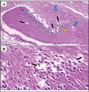 Fig. 1. Photomicrograph of the hippocampus of rat treated with Arabic Gum. (A, B) Neurodegeneration (black arrow) was observed in the dentate gyrus stratum granulosum cells within the affected hippocampus, characterized by the presence of cytoplasmic vacuoles in granule cells. Additionally, the density of granule cells (yellow arrow) was lower in the negative control group than in the positive control group, likely due to neuronal loss in the dentate gyrus. However, the number of granule cells was higher in the positive control group than in the positive control group. In addition, mild neurodegeneration (blue arrow) was observed in neurocyte of Cornu Ammonis region 3. H&E. A: 100x and B: 400x. The Gum Arabic-treated group demonstrated notable improvement relative to the positive control group. Histological analysis (Fig. 3A,B) revealed less severe neurodegeneration, with a higher number of granule cells, suggesting a partial neuroprotective effect. Amyloid beta accumulation was reduced by approximately 50% in the Cornu Ammonis region compared with that in the negative control group (Fig. 4). Statistical analysis confirmed a significant (p < 0.05) increase in cell preservation in the Gum Arabic group compared with the Fenchol and memantine groups. In the Fenchol-treated group, histological assessment showed reduced granule cell density compared with the negative control, but with minimal amyloid beta deposition, particularly in the hippocampus, where plaques were nearly absent (Fig. 5A,B). The histogram in Figure 6 demonstrated a statistically significant (p < 0.05) protective effect in this group compared with both the Gum Arabic and memantine groups. The memantine-treated group also exhibited a degree of neuroprotection. Although a decrease in granule cell density was observed relative to the negative control, it was higher than that observed in other treated groups (Fig. 7A). Table 1 highlights significant (p < 0.05) differences in amyloid beta levels in the memantine group compared with the other groups, suggesting moderate but incomplete protection.