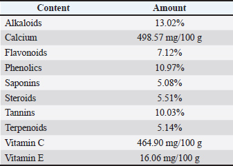 Phytochemical analysis using the thin-layer chromatography method showed that M. oleifera leaf extract contained alkaloids, tannins, terpenoids, steroids, flavonoids, saponins, phenolics, calcium, vitamin C, and vitamin E (Table 1).