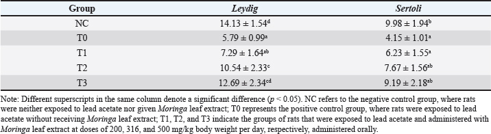 Table 4. Leydig and Sertoli cell counts in the testes of rats (Rattus norvegicus) with lead acetate-induced infection following oral administration of Moringa leaf extract.