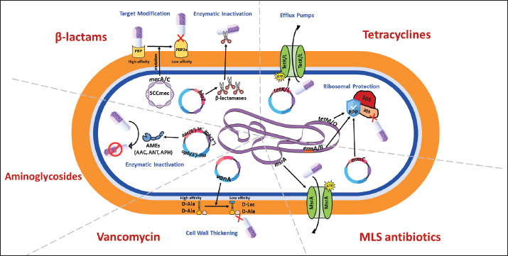 Fig. 1. Molecular mechanisms of antibiotic resistance in Gram-positive mastitis pathogens (Staphylococcus aureus and Streptococcus spp.) Schematic cross-section of a Gram-positive bacterial cell highlighting the predominant resistance strategies against the following key antibiotic classes: β-Lactams, tetracyclines, aminoglycosides, MLS (macrolides, lincosamides, streptogramins), and vancomycin.