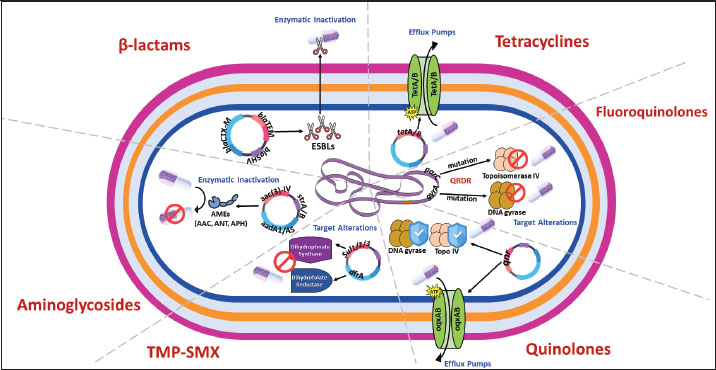 Fig. 2. Molecular mechanisms of antibiotic resistance in Gram-negative mastitis pathogens (Escherichia coli and Pseudomonas spp.). Schematic cross-section of a Gram-negative bacterial cell highlighting the predominant resistance strategies against the following key antibiotic classes: β-Lactams, tetracyclines, aminoglycosides, fluoroquinolones, quinolones, and trimethoprim-sulfonamides (TMP-SMX). Tables 1 and 2 provide a comprehensive overview of the antibiotic resistance gene profiles found in gram-positive and gram-negative bacteria associated with the occurrence of mastitis in bovine, goat, and sheep populations. Understanding the intricate dynamics of resistance mechanisms in bacterial species is crucial for developing more effective strategies to mitigate adverse effects on both animal and public health. In this regard, many techniques and methods have been developed for the more effective application of existing antimicrobial drugs, including combination therapy, immunotherapy, targeted delivery of antimicrobial agents using bacteriophage vectors, recording the antibiotic prescriptions following genotyping and metagenomic analysis of the bacterial source of infection, and more significantly, applying pathogen genomic surveillance for characterizing the development and progression of ARGs within bacterial populations in dairy livestock (Neculai-Valeanu and Ariton, 2022; Elbayoumy et al., 2024; Nesterova et al., 2024; Venkataraman et al., 2024). Furthermore, the necessity of evolving veterinary practices, as well as applying alternative treatment approaches for mastitis, has been highlighted in several articles (Nale and McEwan, 2023). Given the rising concerns of AMR, there is a growing interest in using probiotics, bacteriophages, phage endolysins, bacteriocins (bacteria-derived antimicrobials), animal-derived antimicrobials (such as lactoferrin and propolis), silver nanoparticles, and plant-derived compounds (especially essential oils) (Angelopoulou et al., 2019; Tomanić et al., 2023). These alternatives may help reduce the reliance on antibiotics and the spread of resistance. Table 1. Profiles of ARGs of Gram-positive bacteria isolated from raw milk.