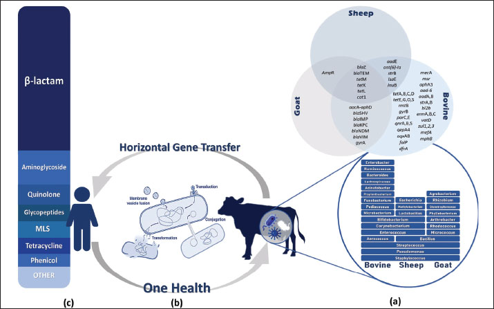 Fig. 3. Diagram of the antibiotic resistance cycle from the perspective of (a) resistant bacteria and resistance genes subdivided by the host (bovine, sheep, and goat), (b) the mechanism of resistance distribution through HGT, and (c) the rate of resistance to different antibiotic groups in humans. In conclusion, it is our collective responsibility to foster our understanding of antibiotic resistance, a globally complex, multifaceted phenomenon, and leverage this knowledge to increase sustainability in veterinary practice, improve food safety in the dairy supply chain, and protect public health in the face of evolving microbial challenges. Although improving milking hygiene and cow comfort (dry-cow therapy and bedding management) are critical to reducing the incidence of mastitis and antibiotic demand, some specific strategies can be adopted to slow the rate of antibiotic resistance in the dairy industry. First, it is recommended to use rapid gene-based diagnostics, such as on-farm ARG testing, before administering antibiotics to guide targeted therapy (De Jong, 2024). Second, implementing alternative therapeutics, namely phage cocktails (e.g., SW21/SW25 for MRSA; StaphLyse™), endolysins, and vaccines against common mastitis pathogens (e.g., S. aureus and E. coli) to reduce antibiotics consumption while combating in vivo dynamics that are difficult to treat (Brouillette et al., 2023). Additionally, routine genomic surveillance, particularly bulk-milk shotgun metagenomics and targeted qPCR screening, could effectively track ARG prevalence and emerging threats in the dairy industry. Finally, a One Health approach was adopted to track ARG flows across farm, food, and clinical settings to facilitate early warnings and policy responses. AcknowledgmentsNone. Conflict of interestThe authors declare no conflict of interest. FundingThe research was conducted within the state assignment of the Russian Federation’s Ministry of Science and Higher Education (project FZGW-2024-0003). Authors’ contributionsShima Kazemzadeh and Mikhail Syromyatnikov substantially contributed to the design of this review article, as well as the interpretation of the scientific material, drafting the manuscript, and critically reviewing it for important intellectual content. Olga Korneeva and Sergey Shabunin contributed to the conception of the study. The final version of the review article was approved by Olga Korneeva and Sergey Shabunin. All authors are accountable for all aspects of the work, ensuring that any questions related to the accuracy or integrity of any part of the work are appropriately investigated and resolved. Data availabilityAll data were provided in the review article. ReferencesAbdelhameed, M.F.M., Almansoori, A.E., Zaid, R. and Ibrahim, M.T. 2025. Comparison bBetween the cConventional bacterial culture and the real time PCR in identifying the dairy cow mastitis causative agents. Sultan Qaboos Univ. J. For Sci. 30, 44–50. Abebe, R., Hatiya, H., Abera, M., Megersa, B. and Asmare, K. 2016. Bovine mastitis: prevalence, risk factors and isolation of Staphylococcus aureus in dairy herds at Hawassa milk shed, South Ethiopia. BMC. Vet. Res. 12, 270. Abril, G.A., Villa, G.T., Barros-Velázquez, J., Cañas, B., Sánchez-Pérez, A., Calo-Mata, P. and Carrera, M. 2020. Staphylococcus aureus exotoxins and their detection in the dairy industry and mastitis. Toxins 12, 537. Adnan, M., Khan, H., Kashif, J., Ahmad, S., Gohar, A., Ali, A., Khan, M.A., Shah, S.S.A., Hassan, M.F. and Irshad, M. 2017. Clonal expansion of sulfonamide resistant Escherichia coli isolates recovered from diarrheic calves. Pak. Vet. J. 37, 230–232. Afroz, F., Shifat, H., Begum, M., Akter, M. and Islam, M. 2024. Molecular characterization of extended spectrum β-lactamase producing Escherichia coli isolated from bovine mastitic milk in Northern Bangladesh. Eur. J. Microbiol. Infect. Dis.,1. Aguirre-Sánchez, J.R., Castro-del Campo, N., Medrano-Félix, J.A., Martínez-Torres, A.O., Chaidez, C., Querol-Audi, J. and Castro-del Campo, N. 2024. Genomic insights of S. aureus associated with bovine mastitis in a high livestock activity region of Mexico. J. Vet. Sci. 25, 42. Ahamd, J., Khan, W., Khan, M.K., Shah, K., Yasir, M., Ullah, I., Ullah, H., Samee, A., Zaman, A. and Khan, R.U. 2022. Antimicrobial resistant and sensitivity profile of bacteria isolated from raw milk in Peshawar, KPK, Pakistan. Ann. Romanian. Soc. for Cell Biol. 26, 364–374. Ahmed, W., Neubauer, H., Tomaso, H., El Hofy, F.I., Monecke, S., Abd El-tawab, A.A. and Hotzel, H. 2021. Characterization of Enterococci- and ESBL-Producing Escherichia coli Isolated from Milk of Bovides with Mastitis in Egypt. Pathogens 10, 97. Alexander, J.A.N., Worrall, L.J., Hu, J., Vuckovic, M., Satishkumar, N., Poon, R., Sobhanifar, S., Rosell, F.I., Jenkins, J., Chiang, D., Mosimann, W.A., Chambers, H.F., Paetzel, M., Chatterjee, S.S. and Strynadka, N.C.J. 2023. Structural basis of broad-spectrum β-lactam resistance in Staphylococcus aureus. Nature 613, 375–382. Algammal, A.M., Hetta, H.F., Elkelish, A., Alkhalifah, D.H.H., Hozzein, W.N., Batiha, G.S., El Nahhas, N. and Mabrok, M.A. 2020. Methicillin-Resistant Staphylococcus aureus (MRSA): one health perspective approach to the bacterium epidemiology, virulence factors, antibiotic-resistance, and zoonotic impact. Infectdrug. Resist. 3255, 3255–3265. Alian, F., Rahimi, E., Shakerian, A., Momtaz, H., Riahi, M. and Momeni, M. 2012. Antimicrobial resistance of Staphylococcus aureus isolated from bovine, sheep and goat raw milk. Global Veterinaria. 8, 111–114. Alonso, C.A., Kwabugge, Y.A., Anyanwu, M.U., Torres, C. and Chah, K.F. 2017. Diversity of Ochrobactrum species in food animals, antibiotic resistance phenotypes and polymorphisms in the blaOCH gene. FEMS Microbiol. Lett. 364, 178. Andreadis, T., 2020. Characterisationof phenotypic and genotypic antibiotic resistance with special consideration of macrolide, lincosamide and streptogra