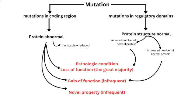 Fig. 2. Mechanisms by which mutations lead to the development of pathological conditions. Mutations in coding regions often produce abnormal proteins that cause function loss, function gain, or novel properties. Mutations in regulatory domains typically maintain protein structure but alter protein levels, which can also result in disease. Heat shock proteins 70One of the responses of cells when experiencing stress, whether in the form of physiological or pathological stress, is the formation of a group of proteins called HSPs (Hu et al., 2022). Exogenous injury agents in the form of temperature stress can trigger changes in gene expression, including the induction of HSPs (Singh et al., 2024). Sonna et al. (2002) stated that there are actually around 100 genes that are expressed when exposed to heat stress and around 20 genes when exposed to cold stress, and HSP genes are expressed in both cells exposed to heat and cold stress. HSP 70 is one of the most sensitive HSPs to temperature changes and is “highly conserved” (Xu et al., 2020). This protein is an ATP-binding protein, and there are at least 4 proteins in the HSP70 group: HSP72, HSP73, HSP75, and HSP78 (Singh et al., 2024). These proteins are synthesized in response to various stimuli. For example, the 73-kDa protein (HSP73 or Hsc 70) is constantly produced, or what is known as constitutive, whereas the 72-kDa protein (HSP72 or HSP70) is highly inducible and its synthesis will increase in response to various stressors (Shin et al., 2004). Therefore, the production of group with HSP is not only due to induction from heat shock or heat stress but is also produced continuously even under normal conditions (Scieglinska et al., 2019). Physiological conditions include development, growth, differentiation, cell cycle, and the presence of oncogenes/protooncogenes, whereas environmental stress is caused by changes in temperature, oxidative stress, nutritional deficiencies, ultraviolet radiation, exposure to chemicals, viral infections, and ischemia-reperfusion conditions (Latchman, 2001). Pathological conditions that stimulate the emergence of HSPs include tissue injury/repair of damaged tissue, neuronal injury, aging process, ischemic/hypoxic, oxidant injury, hypertrophy, fever/inflammation, viral or bacterial infection (Tytell and Hooper, 2001). Therefore, group with HSP play a role in protecting against several stressful conditions. HSPs have biochemical activity as molecular chaperones (HSP40, HSP60, HSP70, and HSP90), repairing proteins that experience misfolding, unfolding, or abnormal folding, protein synthesis, transport, and protein translocation processes, and preventing protein aggregation by participating in protein synthesis, protein folding, transport, and protein translocation processes (Singh et al., 2024). HSP genes are activated after stimulation of the transcription factor, namely HSF (Gomez-Pastor et al., 2018). The central process of HSF activation depends on the balance between the binding of free HSP molecules to HSF and stress-mediated unfolding proteins (Szyller and Bil-Lula, 2021). However, it is not known exactly how stressors can activate HSF. Increased protein damage or abnormalities induce the emergence of a group with HSP (Kalmar and Greensmith, 2009; Hashikawa et al., 2021). The HSP70 activation pathway is initiated when cells experience various physiological or environmental stresses, such as hyperthermia, hypothermia, hypoxia, energy deficit, accumulation of reactive oxygen species (ROS), or acidosis (Wang et al., 2012). In this initial stage, the stressor causes denaturation of intracellular proteins, which then triggers the release of HSF1 from an inactive complex with HSP70 in the cytoplasm (Singh et al., 2024). Once released, HSF1 undergoes activation through phosphorylation, which then induces HSF1 trimerization into its active form. This HSF1 trimer then translocates to the cell nucleus and binds to a specific DNA element called the HSE in the HSP gene promoter (Verma et al., 2014). This binding induces transcription of the HSP70 gene, producing mRNA that is then translated into the HSP70 protein in the cytoplasm. Once synthesized, HSP70 plays a crucial role as a molecular chaperone, stabilizing and assisting in the refolding of denatured proteins, preventing protein aggregation, and maintaining cellular integrity (Singh et al., 2025). Furthermore, HSP70 has anti-apoptotic functions, including inhibiting the release of cytochrome c from mitochondria, interfering with the activation of the apoptosome complex (APAF-1 and caspase-9), and suppressing the activation of caspase-3, the executor of apoptosis (Jäättelä et al., 1998). The scope of HSP70 supplementation in cryobiology has expanded considerably in recent years, with several studies confirming its role in diverse cell types beyond oocytes. In spermatozoa, exogenous HSP70 improves post-thaw motility, maintains acrosomal integrity, and reduces ROS-induced DNA damage, thereby enhancing fertilization potential (Zhou et al., 2016). Similarly, HSP70 supplementation stabilizes the cytoskeleton and improves blastocyst development rates after vitrification and warming, underscoring its importance in early embryogenesis (Stamperna et al., 2021). HSP70 enrichment during cryopreservation was associated with better preservation of mitochondrial function and reduced apoptotic signaling in somatic cells, including stem cells and fibroblasts (Costa-Borges et al., 2025). Collectively, these findings indicate that the protective action of HSP70 is not limited to oocytes but rather represents a broadly conserved cytoprotective mechanism across mammalian cell types. This growing body of evidence highlights the translational potential of HSP70 as a universal supplement in cryopreservation protocols, although optimization strategies may need to be tailored according to cell type and physiological context. The intrinsic apoptosis pathway is initiated by various fo