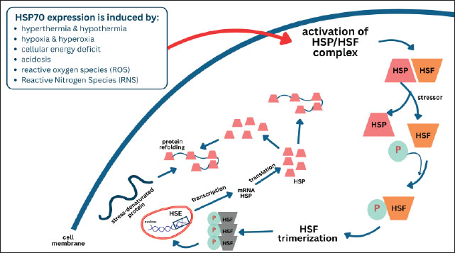 Fig. 3. Activation of the HSF/HSP complex and HSP70 induction. Stressors activate HSF, resulting in its trimerization and binding to HSE, which drives HSP70 transcription. The synthesized HSP70 assists protein refolding and protects cells from stress-induced damage. HSP genes exhibit several properties that allow them to be translated into proteins in situations where other genes’ translation is inhibited. This property is illustrated in the graded response of Drosophila cells exposed to hyperthermia (Pirkkala et al., 2001). Moderate temperature increases (29°C–30°C) cause increased synthesis of HSP mRNA. At higher temperatures (34°C–36°C), normal mRNA translation into protein is inhibited, but HSP mRNA is not. At higher temperatures (37°C–39°C), normal splicing of precursor mRNA is inhibited, but the transcription of most heat-inducible genes escapes inhibition because they lack introns and do not require splicing (Boopathy et al., 2022). The temperature at which HSP synthesis begins varies among species. It is usually several degrees above the normal body temperature of the species (Tomanek, 2010). Protein synthesis involves a very complex process consisting of transcription and translation processes. Protein folding is related to the methylation process that occurs during translation (Waudby et al., 2019). In the translation process, an adaptor factor that acts as a messenger for mRNA to be encoded in the ribosome is needed. This adaptor factor is played by tRNA, which consists of a single chain and comprises 73–93 ribonucleotides (Tamura, 2015). The 5’ end is phosphorylated, and the 3′ end has one free hydroxyl group. This tRNA contains several nucleotides with bases that are not commonly found in other biological units, such as inosine, pseudouridine, dihydrouridine, ribothymidine, and guanosine methyl derivatives (Helm, 2006). Most of these bases result from enzymatic modification by an RNA precursor that catalyzes the methylation of nucleotides A, U, G, and C (Moore et al., 2013). Methylation is performed to prevent base pairs that interfere with the role of tRNA as an adaptor molecule (Wu et al., 2024). Methylation also allows the emergence of hydrophobic properties in certain parts of the tRNA molecule that will play an important role in the interaction with synthetase enzymes and ribosomal proteins (Gomez and Ibba, 2020). The methylation process is required by many proteins to perform their cellular functions (Małecki et al., 2022). Some possible mechanisms for cell protection include the binding of HSP70 to parts of the unfolded protein that are rich in hydrophobic residues produced by the methylation process (Mayer and Bukau, 2005). The energy of ATP hydrolysis is then used to release the HSP from its substrate, and the resulting changes are thought to increase the likelihood of the denatured protein refolding to its original shape (Szabo et al., 1994). Braakman and Hebert (2013) stated that there is a protein folding process from polypeptides that have been in the ER with the help of HSPs and ATP. HSP70 has an affinity for the hydrophobic part of denatured or mutated proteins, even in normal proteins. HSP70 maintains certain proteins in an unfolded state until these proteins undergo transport through the membrane into the ER or mitochondria (Saibil, 2013). Oocyte protection by HSP70 during vitrificationThe negative effects of the vitrification method on oocytes are in the form of cell stress caused by osmotic injury, toxic injury, and temperature injury (Chang et al., 2022). The presence of osmotic damage, cryoprotectant toxicity, and damage due to changing temperatures from hot to cold to reheating in the vitrification process series, namely in vitro maturation, vitrification, and rewarming or thawing, necessitates attention to damage to cell organelles and cell protein structures (Li et al., 2024). Damage to cell organelles and cell protein structures greatly affects oocyte viability, both after vitrification, during IVF, and during the embryo development phase (López et al., 2021). Until now, how the HSP70 protection mechanism works against cell stress is unknown. Cell stress and the number of denatured or damaged proteins increase the need for a group with HSP (Hu et al., 2022). It is suspected that the cell protection mechanism carried out by HSP70 due to temperature stress on the cell stress with the ability to help protein folding and inhibit apoptosis (Mosser et al., 2000). Several studies have been conducted to prove the expression of HSP70 under extreme temperature conditions. Vendrell-Flotats et al. (2017) evaluated the effects of heat stress on oocyte function after in vitro maturation as assessed by cell development and division, then related to the effects on membrane integrity and protein synthesis. The results showed that oocyte thermolability may be related to changes in protein synthesis and the absence of the ability to induce group with HSP. Furthermore, heat stress in bovine embryos induces changes in protein synthesis and possibly gene expression in the developing 2-cell embryo. Cumulus cells play a thermoprotective role during maturation. The presence of HSP70 was also reported by Lang et al. (2000). The results showed that the expression of HSP70 mRNA controls the condition of the embryo so that it responds to heat stress by inducing HSP70 mRNA. The presence of HSP70 in oocytes and embryos showed that the distribution of HSP70 in the ooplasm of mature oocytes and immature oocytes was not affected by exposure to high temperatures, and this protein is adjacent to the spindle, indicating that HSP70 possibly plays a role in stabilizing the spindle structure. HSP70 is distributed in the cytoplasm of 8-cell embryos but appears as aggregates in some embryos exposed to high temperatures. Blastocysts are more resistant to high temperatures. From the research conducted, it appears that HSP70 is induced as a mechanism of cell protection aga