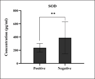 Fig. 14. Levels of antioxidant SOD markers among the positively (total number=19) and negatively (total number=108) infected dogs with colibacillosis; significance ** (p < 0.0081).
