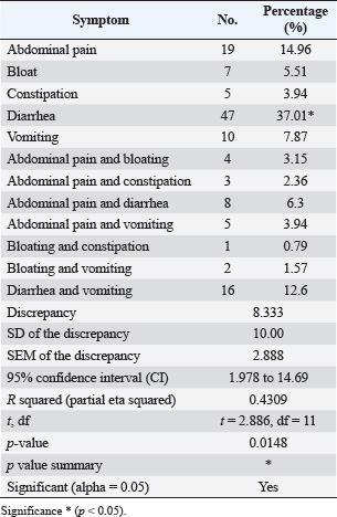 ABSTRACTBackground: Gastrointestinal disorders in dogs are important clinical conditions in veterinary medicine, which have multifactorial non-infectious and infectious etiologies. Colibacillosis, caused by Escherichia coli, is an infectious bacterial disease that contributes to host health and pathogenic variants that are responsible for a wide spectrum of diseases. Aim: This study aims to investigate the prevalence rate of gastrointestinal signs in diseased pet dogs, phylogenetic analysis of colibacillosis, measurement of antibiotic sensitivity, and levels of immune and antioxidant markers in dog populations. Methods: A total of 127 pet dogs admitted with various gastrointestinal signs were examined clinically. Fresh fecal samples were traditionally and molecularly analyzed to identify E. coli isolates for phylogenetic analysis and antibiotic susceptibility. The cephalic venous blood samples were examined quantitatively by enzyme-linked immunosorbent assay to measure immune markers such as interleukins (IL-1, IL-4, IL-6, and IL-8) and interferon-alpha (INF-α), as well as antioxidants such as catalase (CAT), glutathione (GSH), superoxide dismutase (SOD), and malondialdehyde (MDA). Results: Clinically, diarrhea was the most identified gastrointestinal sign in the study dogs. Traditional findings revealed that 14.96% of fecal samples were positive to E. coli isolates that showed a high sensitivity to antibiotics such as meropenem, levofloxacin, and ciprofloxacin with a significant resistance to amoxicillin and ampicillin. Molecularly, 78.95% of study isolates were positive to E. coli strains, which were found to be phylogenetically (NCBI-BLAST) identical to the Iraqi strain (LC844819.1). Serologically, elevated levels of IL-1, IL-6, IL-8, and MDA with reduced levels of IL-2, CAT, GSH, and SOD were observed in E. coli-positive dogs. However, no significant alteration was seen in values of INF-α among the dogs with and without colibacillosis. Conclusion: The present study represents a multifaceted analysis of the incidence rate of gastrointestinal disorders in pet dogs, prevalence rate of E. coli using traditional and molecular phylogenetic diagnostics, and the association of colibacillosis to immune and antioxidant markers in Iraq. Keywords: Canine gastrointestinal infections, Escherichia coli, Interferon, Interleukin, Oxidative stress, Iraq. IntroductionGastrointestinal disorders in dogs encompass a wide range of etiologies, ranging from acute self-limiting to chronic debilitating diseases requiring intensive management. Therefore, understanding the multifaceted nature of canine gastrointestinal health is crucial for effective diagnosis and therapeutic intervention (Isidori et al., 2022; Kollannur et al., 2024). The prevalence of infectious diseases poses a substantial threat to both animals and humans, with an estimated 60% of known pathogens and up to 75% of new or re-emerging diseases resulting in severe economic losses and global health impacts (Marks et al., 2011; Bloom and Cadarette, 2019). The emergence of antibiotic resistance in many bacterial species further compounds this challenge, threatening the efficacy of conventional treatments and necessitating innovative therapeutic strategies (Stachelek et al., 2021). However, gastrointestinal disorders in dogs frequently occur as a result of dysbiosis of gut microbiota, particularly alterations in the population dynamics of Enterobacteriaceae, including alterations in microbial diversity, reduction in beneficial organisms, and increase in potentially harmful ones (Pilla and Suchodolski, 2020; Ziese and Suchodolski, 2021). Colibacillosis is an important disease for humans and animals, as it is caused by Escherichia coli, a typical pathogenic bacterium (Poirel et al., 2018; Fairbrother and Nadeau, 2019). Escherichia coli is a highly diverse and adaptable Gram-negative bacterium, which was first identified in the 1885s and further characterized in the 1886s due to its dual nature, encompassing both commensal strains that contribute to host health and pathogenic variants that are responsible for a wide spectrum of diseases (Riley, 2020; Ruiz and Silhavy, 2022). Commensal strains play beneficial roles in nutrient processing, immune protection, and vitamin K production; however, some strains are pathogenic and can induce various intestinal and extraintestinal diseases (Namazi et al., 2019; Ramos et al., 2020; Riley, 2020). In recent decades, the remarkable adaptability of E. coli has emerged due to its capacity to rapidly evolve and acquire new traits through horizontal gene transfer, mutation, and recombination, leading to the emergence of novel pathotypes and antimicrobial resistance (Nasrollahian et al., 2024; Saini et al., 2024). Diagnostic scrutiny often necessitates a multifaceted approach, integrating historical data, physical examination findings, and laboratory analyses to pinpoint the causative factors and initiate targeted treatment intervention (Riaz et al., 2023; Singh et al., 2024). In Iraq, few studies have been performed in dogs to determine the virulence genes of the pathogenic E. coli or its antimicrobial resistance (Yousif et al., 2016; Al-Kubaisi et al., 2020; Kadhim and Alrammah, 2024; Taalab et al., 2024). Hence, this study aimed to investigate the prevalence rate of colibacillosis in dogs with gastrointestinal infections based on clinical, traditional, and molecular data and to measure the levels of immunity and antioxidants in the dogs. This study also determined the incidence of antimicrobial resistance in the E. coli isolates. Materials and MethodsAnimal data and samplesA total of 127 diseased dogs with different clinical gastrointestinal signs were admitted to the private clinics located in Wasit province (Iraq) from October 2024 to March 2025. Initially, fresh fecal samples were collected from each animal into labeled plastic containers. Then, 2.5 ml of cephalic vein blood was collected from each animal and pla