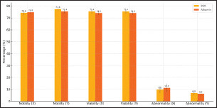 Fertility PerformanceFrozen semen produced from sexed sperm using Bovine Serum Albumin (BSA) and Albumin media was utilized for artificial insemination (AI). The semen freezing process followed the protocols described by Diansyah et al. (2023), while the AI procedure adhered to the guidelines outlined by Prasad et al. (2021). The fertility performance of sexed sperm was evaluated based on the pregnancy rate, defined as the proportion of sheep that became pregnant out of a total of 300 sheep inseminated during each estrous cycle (Mohar et al. 2022). Statistical AnalysisThe observed parameters included sperm quality, sperm kinematics, validation of sperm sexing, and pregnancy rate. Data were reported as mean ± standard deviation (Mean ± SD). Before statistical analysis, all parameter values were tested for normality and homogeneity of variances using the Kolmogorov-Smirnov test. Since the data did not follow a normal distribution, comparisons between sperm sexing methods (BSA and Albumin) were performed using the non-parametric Mann-Whitney U test. Differences were considered statistically significant at p < 0.05. Additionally, Pearson correlation analysis was conducted to evaluate the relationships among all observed parameters, including sperm quality, sperm kinematics, validation of sperm sexing, and pregnancy rate. All statistical analyses were performed using SPSS version 25 for Windows (IBM Corp., Chicago, IL, USA). Ethical ApprovalEthical approval for this research was obtained from the Animal Care and Use Committee of the National Research and Innovation Agency (Reference No. 204/KE.02/SK/11/2023). ResultsSperms Quality and Kinematic SeparationThe sperm quality before the sexing of Garut rams, including motility, viability, and sperm abnormality were presented in Figure 1. The average sperm motility, sperm viability, and sperm abnormality were 70.40%, 78.40%, and 7.80%, respectively. All sperm quality is an initial test before further semen processing treatment is carried out. After the sexing of Garut rams, the sperm quality was presented in Figure 2..The average sperm motility of Garut rams after sexing is higher in Y-sexed sperm on the BSA medium than in Y-sexed sperm on the Albumin medium. Furthermore, the viability of Garut rams sperm after sexing in X-sexed and Y-sexed sperm in each medium has an average of 74-75%. The abnormalities of Garut rams sperm after sexing have the highest average in the abnormality of X-sexed sperm on albumin media (11.2%) and the lowest in Y-sexed sperm on albumin media (6.28%). However, sperm motility, sperm viability, and sperm abnormality of X-sexed and Y-sexed between BSA and Albumin medium showed no significant difference (p>0.05).