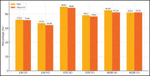 Figure 8: Sperms Motion Pattern After Sexing of Garut Rams The results of statistical analysis of the mean value of sperm movement patterns in WOB sexing results (Figure 8) showed significant differences between sperm sexed on BSA medium and albumin medium in X-sexed sperm (p<0.05). At the same time, statistical analysis of the mean value of sperm movement patterns of LIN, STR in sexed-X and sexed-Y sperm, and WOB of sexed-Y sperm between BSA and Albumin medium did not show significant differences (p>0.05). Validation of X and Y Sperms FractionsMorphometric measurements show that X-sperm are generally larger than Y-sperm, differences in individual morphometric parameters are not always significant in different bulls, but morphometric measurements are still used as a reference in determining the proportion of X-sperm and Y-sperm. Validation of X-sexed sperm and Y-sexed sperm fractions showed (shown in Fig. 9) significant differences (p<0.05) in each sexing medium. X-sexed fraction sperm was higher in BSA medium compared to Albumin medium, it was also the same for Y-sexed fraction sperm. The results indicated that the mean percentage of sexed-X sperm in the treatments ranged between 65.40% and 62.80%, while the percentage of sexed-Y sperm varied between 66.40% and 61.60% in BSA medium and Albumin medium, respectively. X-sexed sperm have larger head morphometry than do Y-sexed sperm.