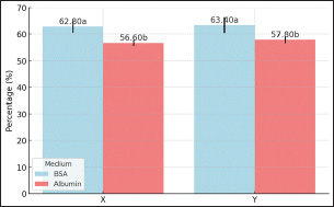 Figure 9: Validation of X and Y Sperms Fraction of Garut Rams; Means with different superscripts differ on the same sperm sexed significantly at p < 0.05. Fertility Performance Post-Artificial InseminationThe timing of AI, reproductive health, semen quality, and environmental factors are critical determinants of pregnancy rates in cows. Optimizing these factors through careful management and monitoring can significantly enhance reproductive success. Fertility performance after artificial insemination resulted (shown in Fig. 10) in varying mean percentage values and showed significant differences (p<0.05). The percentage of fertility performance of sexed-X sperm was higher in BSA medium compared to Albumin medium, 62.80% and 56.60% respectively, the same thing happened to the fertility performance of sexed-Y sperm 63.40% and 57.80% respectively. Knowing the fertility performance of X and Y sperm will provide many benefits that can improve the selection of the right method of sperm sexing. DiscussionGarut rams is highly valued in Indonesia, not only for their exceptional meat production but also for its cultural significance (Rusdiana et al. 2021; Sujarwanta et al. 2024). As an integral part of both the economy and traditional practices, Garut rams plays a vital role in Indonesia’s agriculture and livestock industry (Maulana et al. 2022). Given the growing demand for efficient breeding techniques, sperm sexing technology has become essential in enhancing meat production and milk yields in Garut rams by enabling controlled selection of offspring gender (Rusdiana et al. 2021; Dovenski et al. 2022). This study assessed the efficacy of BSA column and Albumin column methods for sperm sexing in Garut rams, providing valuable insights into their potential for improving the efficiency and productivity of this breed. The quality of sperm is a crucial determinant of successful artificial insemination (AI), as it directly impacts the ability of sperm to reach and fertilize the oocyte. This study found that BSA column was more effective in preserving motility than Albumin column, which is essential for successful fertilization. Although viability did not differ significantly between the two methods (p>0.05), the BSA column better maintained membrane integrity, which is crucial for sperm capacitation and acrosomal reaction during fertilization (Maulana et al. 2022). Utami et al. (2025), concluded that 20%-65% gradient was more effective in maintaining sperm quality, further more Post-sexing motility and kinetic parameters were reduced compared to fresh semen Holstein-Friesian bulls. Nurcholis et al. (2024), has found that 2%:4% Ophiocephalus striatus fish albumin extract (OSAE) concentration produced the highest sperm motility and viability post-thawing, while the 4%:6% concentration was effective for separating X and Y sperm of Brahman cross bulls. In the meantime, Yendraliza et al. (2023), founded that adding up to 0.4% sucrose to Tris-Egg Yolk Diluent maintained motility, viability, and integrity of cell membranes and acrosomes in sexed sperm. Furthermore, kinematics, including progressive velocity (VSL) and curvilinear distance (DCL), were significantly improved in sperm separated using BSA column. This enhanced kinematic performance suggests that sperm separated by BSA column are more efficient at navigating toward and interacting with the oocyte, thereby increasing the likelihood of successful fertilization (Sahiruddin et al. 2021). In contrast, sperm separated by the Albumin column exhibited reduced kinematic performance, likely due to the viscosity of the medium, which increases osmotic stress on sperm, thereby impairing their motility and movement efficiency (Afriani et al. 2022).