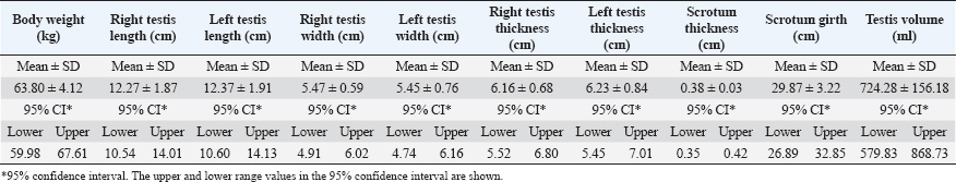 In the present study, the average right testicle length was 12.27 ± 1.87 cm, and the average left testicle length was 12.37 ± 1.91 cm in rams of the Southern Karaman breed. These values were determined as 10.8 ± 0.06 and 10.8 ± 0.06 in Akkaraman rams, 10.07 ± 0.08 and 10.08 ± 0.10 in İvesi rams, 10.5 ± 0.12 and 10.5 ± 0.16 in Dağlıç rams, and 9.7 ± 0.06 and 9.7 ± 0.03 in Sakız rams, respectively (Gündoğan et al., 2002). Similarly, the average testicular length of Karakoyun rams, a local breed, was measured as 12.31 ± 0.48 cm (Kulaksız et al., 2010). The testicle length of Kangal Akkaraman rams, a variety of the Akkaraman breed, was 12.21 ± 1.24 cm during the breeding season and 11.72 ± 1.30 cm outside the breeding season (Koçyiğit et al., 2021). The average testicular length of the Karayaka rams was measured as 9.2 ± 0.11 cm by Koyuncu et al. (2000). The testicular length of the Southern Karaman rams was higher than that of Akkaraman, İvesi, Dağlıç, Sakız, and Karayaka rams and was close to the testicular lengths of the Karakoyun and Kangal Akkaraman rams. In the study, the average testicular widths of the Southern Karaman rams were measured as 5.47 ± 0.59 cm and 5.45 ± 0.76 cm for the right and left testicles, respectively. In studies conducted with different breeds, these values were 7.0 ± 0.12 and 6.9 ± 0.12 cm in Akkaraman rams, 6.7 ± 0.06 cm and 7.1 ± 0.06 cm in İvesi rams, 6.7 ± 0.09 and 6.9 ± 0.10 and 7.2 ± 0.07 cm and 7.3 ± 0.06 cm in Sakız rams, 4.1 ± 0.05 and 5.90 ± 0.18 cm in Karayaka rams, 5.64 ± 0.92 cm in Karya rams, and 5.19 ± 0.90 cm in Çine Çaparı (Koyuncu et al., 2000; Gündoğan et al., 2002; İnce and Karaca, 2009; Kulaksız et al., 2010). When these measurement results were compared, it was determined that the testicular widths were close in the Southern Karaman, Karayaka, Karya, and Çine Çaparı rams. In this study, the average scrotal thickness and average scrotal girth length were measured as 0.38 ± 0.03 and 29.87 ± 3.22 cm, respectively, in rams of the Southern Karaman breed. In the previous studies, scrotal thickness and scrotal girth lengths of Akkaraman, İvesi, Dağlıç, Sakız, and Karayaka rams were measured as 0.6 ± 0.03, 0.57 ± 0.01 and 34.3 ± 0.44 cm, 35.3 ± 0.56, 32.2 ± 0.17, 33.7 ± 0.88, 29.80 ± 1.08 cm, respectively (Gündoğan et al., 2002; Kulaksız et al., 2010). In Karya and Çine Çaparı rams, the scrotal girth length was measured as 33.98 ± 0.36 and 32.70 ± 0.34 cm, respectively (İnce and Karaca, 2009). In a study in which the scrotal girth length of Kangal Akkaraman rams was evaluated in and out of the breeding season, the scrotal width was determined as 33.94 ± 4.02 cm in the breeding season and 32.33 ± 4.07 cm out of the breeding season (Koçyiğit et al., 2021). When the values obtained from different breeds were compared, it was concluded that scrotal thickness was lower in Southern Karaman breed rams than in other breeds, and scrotal girth length was close to that of Karayaka breed rams. In this study, the volume of testicles in Southern Karaman breed rams was determined as 724.28 ± 156.18 ml. This value was measured as 813.3 ± 11.16, 916.7 ± 2.11, 841.7 ± 11.55, 776.7 ± 11.16, and 573.70 ± 25.66 ml in Akkaraman, İvesi, Dağlıç, Sakız, and Karayaka rams, respectively (Gündoğan et al., 2002; Kulaksız et al., 2010). In this study, spermatological parameters were also examined in Southern Karaman breed rams, and an average volume of 0.64 ± 0.22 ml of semen was obtained. This volume was measured as 1.1 ± 0.02, 1.0 ± 0.02, 0.9 ± 0.01, 1.0 ± 0.02, and 0.98 ± 0.08 ml in Akkaraman, İvesi, Dağlıç, Sakız, and Karayaka rams, respectively (Gündoğan et al., 2002; Kulaksız et al., 2010). In a study conducted by Koçyiğit et al. (2021) with Kangal Akkaraman rams, semen was collected both during and outside the breeding season, and the semen volume was reported as 1.26 ± 0.12 and 1.02 ± 0.21 ml, respectively. When these results were evaluated, it was observed that in one ejaculation, rams of the Southern Karaman breed gave less volume of semen compared with rams of other breeds. Mass activity was found to be 4.28 ± 0.95 on average in rams of the Southern Karaman breed in this study. This spermatological parameter was found to be 4.77 in Karya rams and 3.58 in Çine Çaparı breed (İnce and Karaca, 2009). In Akkaraman, İvesi, Dağlıç, Sakız, Karakaş, and Norduz rams, the mass activity was determined as 4.60 ± 0.09, 4.50 ± 0.09, 4.30 ± 0.09, 4.60 ± 0.09, 3.77 ± 0.08, and 3.81 ± 0.07, respectively (Gündoğan et al., 2002; Karakuş and Cengiz, 2007). In Kangal Akkaraman rams, the mass activity was found to be 4.27 ± 0.46 during the breeding season and 3.55 ± 0.51 outside the breeding season (Koçyiğit et al., 2021). It is concluded that the mass activity in Southern Karaman rams had very close averages with Dağlıç and Kangal Akkaraman rams within the breeding season. Total motility, which is an important parameter for evaluating fertility, was found to be 81.42% ± 12.14% in the Southern Karaman rams. Total motility values were 81.7% ± 1.08% in Akkaraman rams, 80.7% ± 0.95% in İvesi rams, 78.3% ± 1.01% in Dağlıç rams, 82.3% ± 1.04% in Sakız rams, 79.35 ± 0.88% in Karayaka rams, 87.27% ± 0.68% in Karakaş rams, and 88.62% ± 0.56% in Norduz rams (Gündoğan et al., 2002; Karakuş and Cengiz, 2007; Kulaksız et al., 2010). In a study conducted with Kangal Akkaraman rams in and out of the breeding season, total motility values were found to be 85.55% ± 4.50% and 76.94% ± 5.46%, respectively (Koçyiğit et al., 2021). In a study in which some spermatological parameters of four different breeds, including Akkaraman and İvesi rams, were examined, total motility values of Akkaraman, İvesi, Corriedale, and Merinos rams were found to be 65.7%, 65.5%, 68.1%, and 65.4%, respectively (Aksoy et al., 1994). Similarly, in a study including Akkar