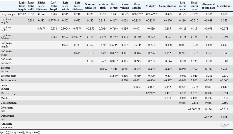 Open Vet. J.. 2025; 15(8): 3711-3718 Open Veterinary Journal, (2025), Vol. 15(8): 3711-3718 Research Article Determination of andrological and spermatological parameters in Southern Karaman breed rams under threat of extinctionTutku Can Acısu1*, Emine Yüksel2, Tülay Canatan Yılmaz3, Aslıhan Çakır Cihangiroğlu4, Nida Badıllı1, Yasin Baykalır5, Emre Kaya6 and Ülkü Gülcihan Şimşek71Department of Reproduction and Artificial Insemination, Faculty of Veterinary Medicine, Fırat University, Elazığ, Turkey 2Faculty of Veterinary Medicine, Fırat University, Elazığ, Turkey 3Bahri Dağdaş International Agricultural Research Institute, Konya, Turkey 4Department of Reproduction and Artificial Insemination, Faculty of Veterinary Medicine, Siirt University, Siirt, Turkey 5Department of Biostatistics, Faculty of Veterinary Medicine, Balıkesir University, Balıkesir, Turkey 6Department of Biochemistry, Faculty of Veterinary Medicine, Fırat University, Elazığ, Turkey 7Department of Animal Science, Faculty of Veterinary Medicine, Fırat University, Elazığ, Turkey *Corresponding Author: Tutku Can Acısu. Department of Reproduction and Artificial Insemination, Faculty of Veterinary Medicine, Fırat University, Elazığ, Turkey. Email: tcacisu [at] firat.edu.tr Submitted: 23/04/2025 Revised: 05/07/2025 Accepted: 14/07/2025 Published: 31/08/2025 © 2025 Open Veterinary Journal